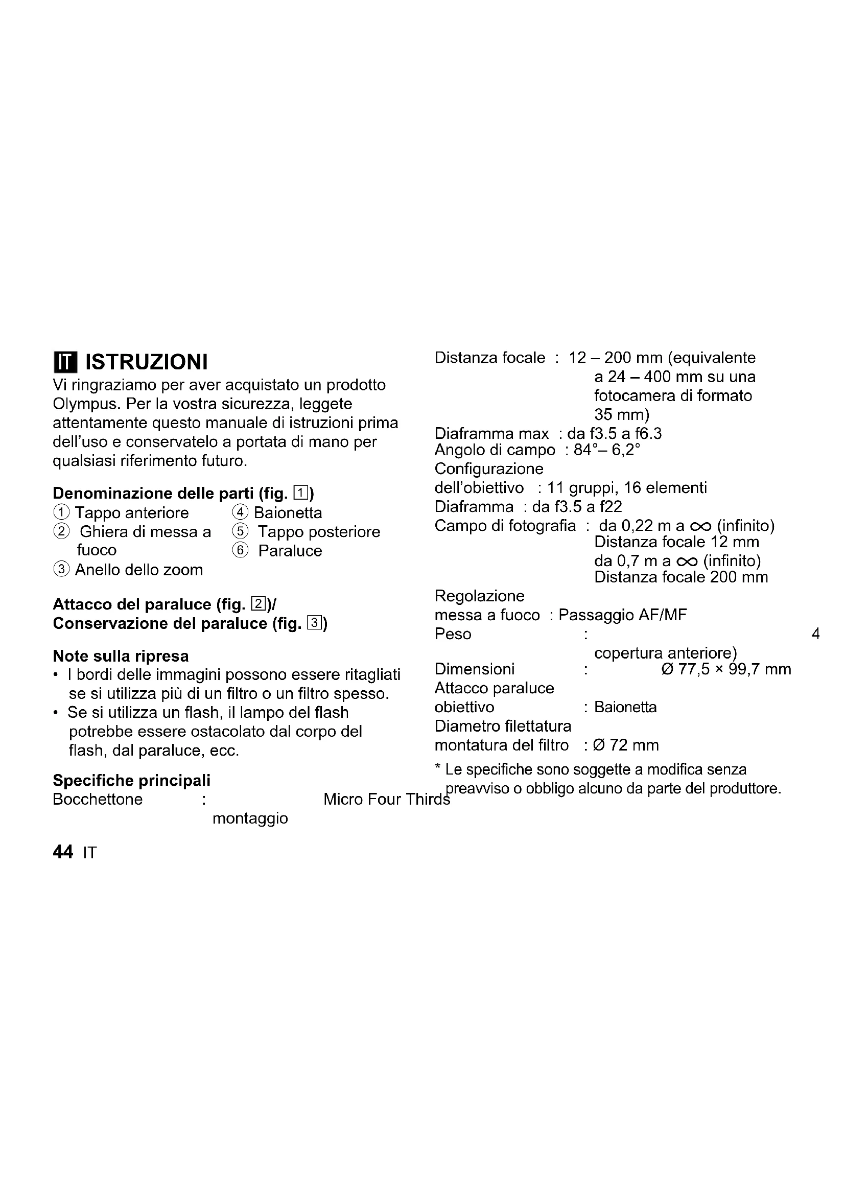 - Se si utilizza un flash, il lampo del flash potrebbe essere ostacolato dal corpo del flash, dal paraluce, ecc. Specifiche principali Bocchettone : Micro Four Thirds montaggio Distanza focale : 12 – 200 mm (equivalente a 24 – 400 mm su una fotocamera di formato 35 mm) Diaframma max : da f3.5 a f6.3 Angolo di campo : 84°– 6,2° Configurazione dell’obiettivo : 11 gruppi, 16 elementi Diaframma : da f3.5 a f22 Campo di fotografia : da 0,22 m a ) (infinito) Distanza focale 12 mm da 0,7 m a ) (infinito) Distanza focale 200 mm Regolazione messa a fuoco : Passaggio AF/MF Peso : 455 g (esclusi paraluce e copertura anteriore) Dimensioni : Ø 77,5 × 99,7 mm Attacco paraluce obiettivo : Baionetta Diametro filettatura montatura del filtro : Ø 72 mm