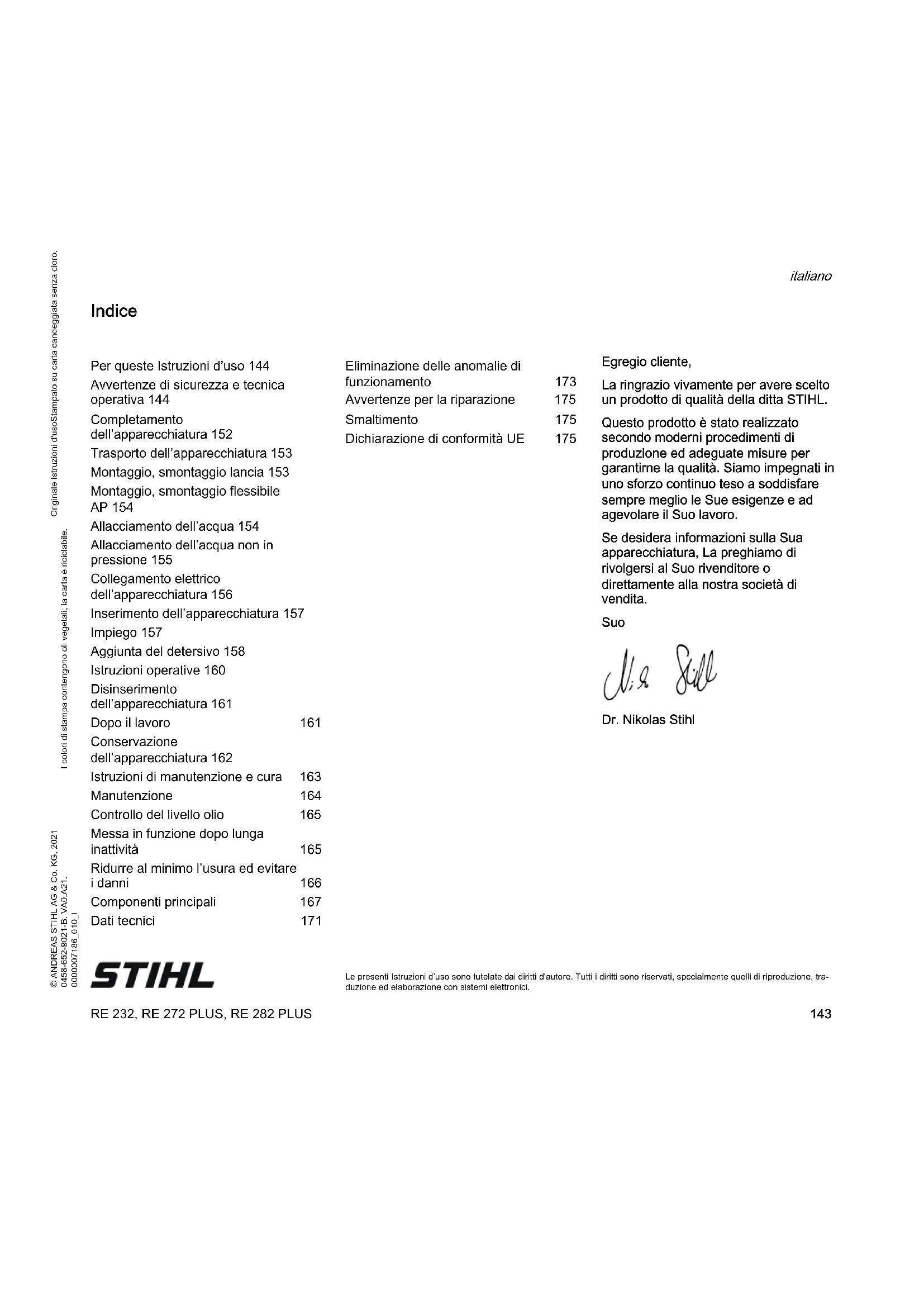Le presenti Istruzioni d’uso sono tutelate dai diritti d'autore. Tutti i diritti sono riservati, specialmente quelli di riproduzione, tra- duzione ed elaborazione con sistemi elettronici. Indice Egregio cliente, La ringrazio vivamente per avere scelto un prodotto di qualità della ditta STIHL. Questo prodotto è stato realizzato secondo moderni procedimenti di produzione ed adeguate misure per garantirne la qualità. Siamo impegnati in uno sforzo continuo teso a soddisfare sempre meglio le Sue esigenze e ad agevolare il Suo lavoro. Se desidera informazioni sulla Sua apparecchiatura, La preghiamo di rivolgersi al Suo rivenditore o direttamente alla nostra società di vendita. Suo Dr. Nikolas Stihl Per queste Istruzioni d’uso 144 Avvertenze di sicurezza e tecnica operativa 144 Completamento dell’apparecchiatura 152 Trasporto dell’apparecchiatura 153 Montaggio, smontaggio lancia 153 Montaggio, smontaggio flessibile AP 154 Allacciamento dell’acqua 154 Allacciamento dell’acqua non in pressione 155 Collegamento elettrico dell’apparecchiatura 156 Inserimento dell’apparecchiatura 157 Impiego 157 Aggiunta del detersivo 158 Istruzioni operative 160 Disinserimento dell’apparecchiatura 161 Dopo il lavoro 161 Conservazione dell’apparecchiatura 162 Istruzioni di manutenzione e cura 163 Manutenzione 164 Controllo del livello olio 165 Messa in funzione dopo lunga inattività 165 Ridurre al minimo l’usura ed evitare i danni 166 Componenti principali 167 Dati tecnici 171 Eliminazione delle anomalie di funzionamento 173 Avvertenze per la riparazione 175 Smaltimento 175 Dichiarazione di conformità UE 175RE 232, RE 272 PLUS, RE 282 PLUS italiano