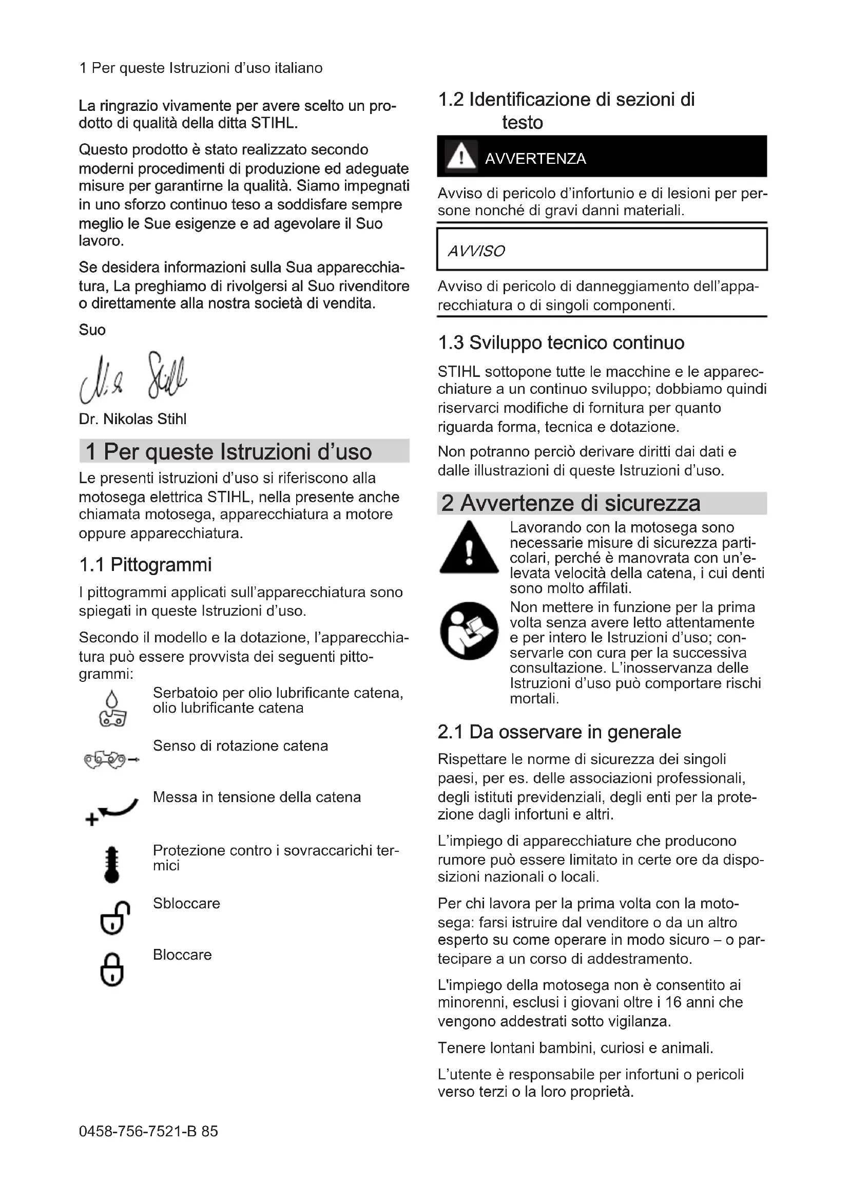 - 35 Avvertenze di sicurezza generali per attrezzi elettrici Egregio cliente, italiano 84 0458-756-7521-B © ANDREAS STIHL AG & Co. KG 2022 0458-756-7521-B. VA1.C22. Stampato su carta candeggiata senza cloro. I colori di stampa contengono oli vegetali; la carta è riciclabile. Originale Istruzioni d'uso 0000006380_020_ILa ringrazio vivamente per avere scelto un pro‐ dotto di qualità della ditta STIHL. Questo prodotto è stato realizzato secondo moderni procedimenti di produzione ed adeguate misure per garantirne la qualità. Siamo impegnati in uno sforzo continuo teso a soddisfare sempre meglio le Sue esigenze e ad agevolare il Suo lavoro. Se desidera informazioni sulla Sua apparecchia‐ tura, La preghiamo di rivolgersi al Suo rivenditore o direttamente alla nostra società di vendita. Suo Dr. Nikolas Stihl 1 Per queste Istruzioni d’uso Le presenti istruzioni d’uso si riferiscono alla motosega elettrica STIHL, nella presente anche chiamata motosega, apparecchiatura a motore oppure apparecchiatura. p. 120
