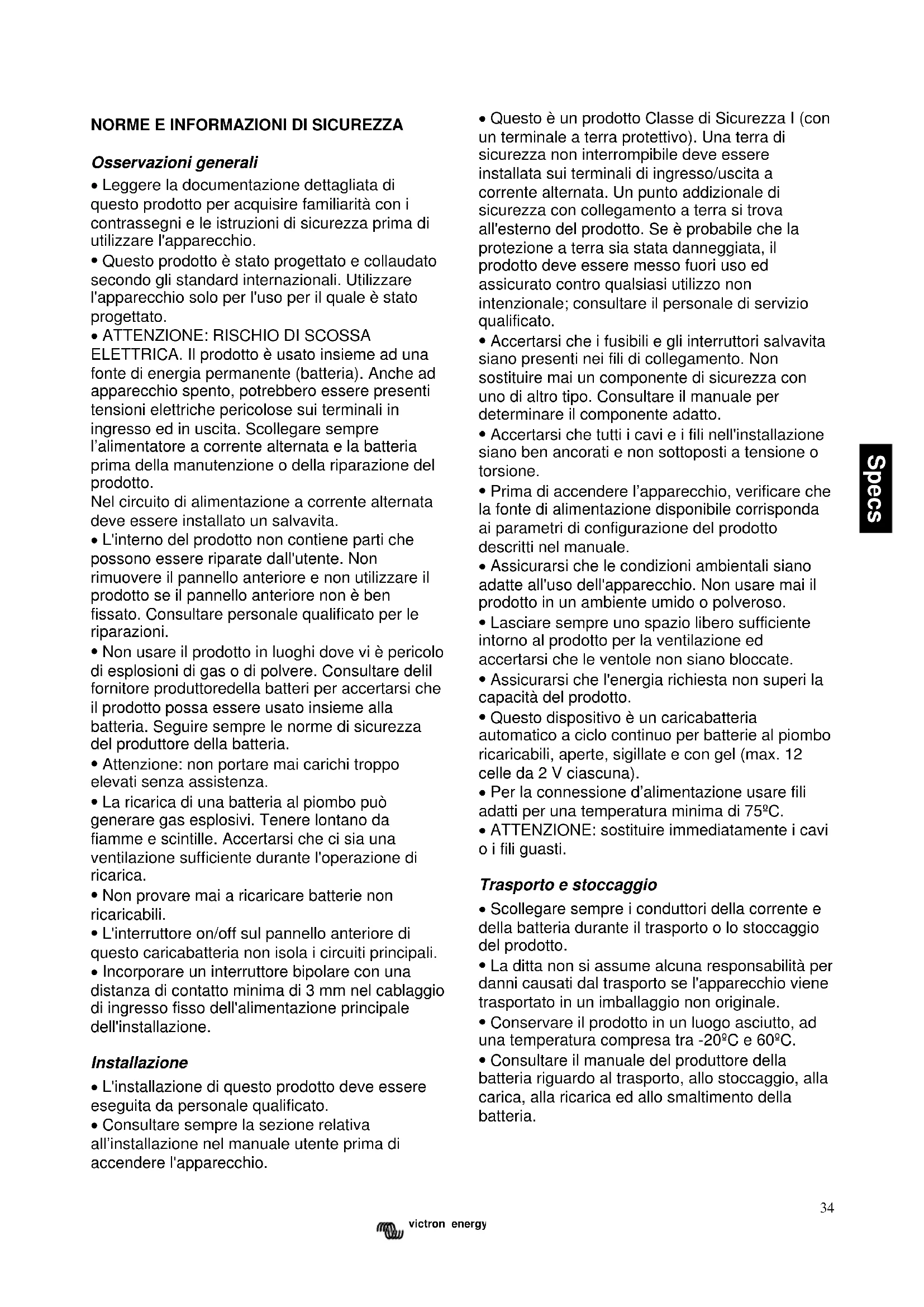 Consultare il manuale del produttore della batteria riguardo al trasporto, allo stoccaggio, alla carica, alla ricarica ed allo smaltimento della batteria.35 victron energy
