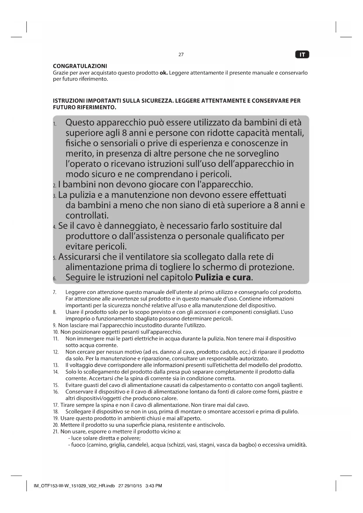 - Durante il funzionamento, non inserire dita o altri oggetti nella protezione. IM_OTF153-W-W_151029_V02_HR.indb 29 29/10/15 3:43 PM30
