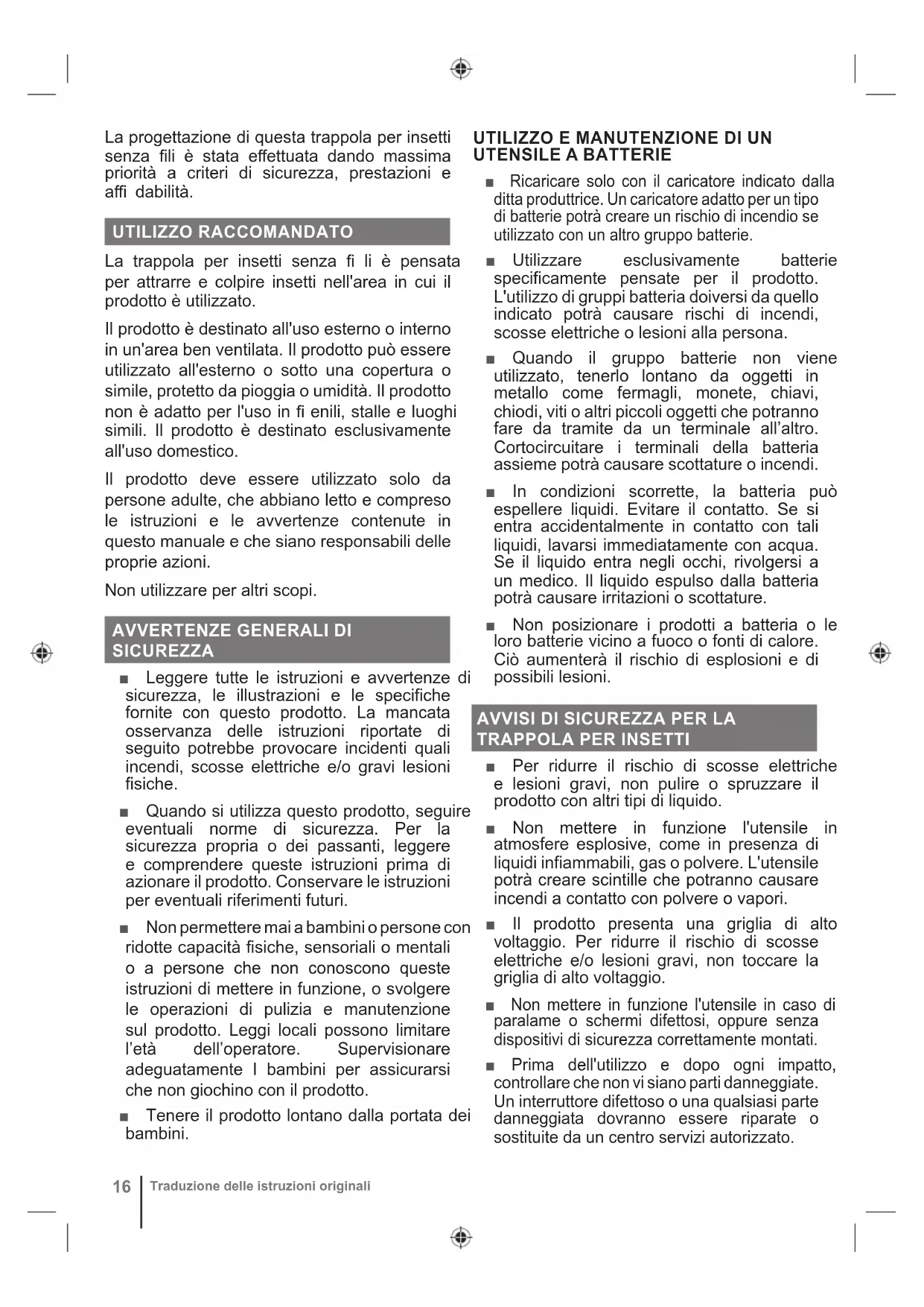 Nota Advertencia Las piezas o accesorios se venden por separado16 Traduzione delle istruzioni originali La progettazione di questa trappola per insetti senza fi li è stata eff ettuata dando massima priorità a criteri di sicurezza, prestazioni e affi dabilità. UTILIZZO RACCOMANDATO La trappola per insetti senza fi li è pensata per attrarre e colpire insetti nell'area in cui il prodotto è utilizzato. Il prodotto è destinato all'uso esterno o interno in un'area ben ventilata. Il prodotto può essere utilizzato all'esterno o sotto una copertura o simile, protetto da pioggia o umidità. Il prodotto non è adatto per l'uso in fi enili, stalle e luoghi simili. Il prodotto è destinato esclusivamente all'uso domestico. Il prodotto deve essere utilizzato solo da persone adulte, che abbiano letto e compreso le istruzioni e le avvertenze contenute in questo manuale e che siano responsabili delle proprie azioni. Non utilizzare per altri scopi.