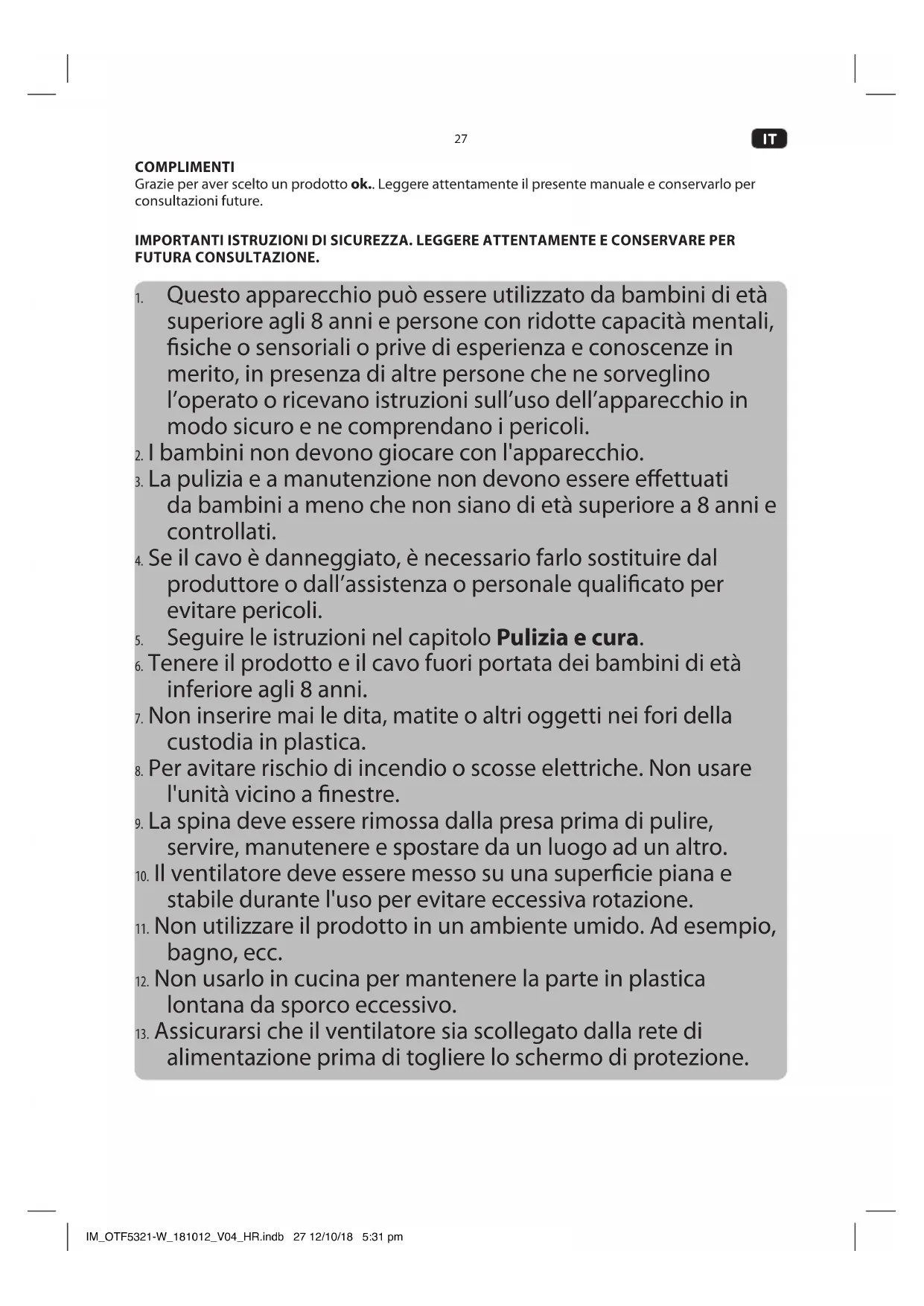 57 dB(A) Velocità massima dell’aria c 2,3 m/s Misurazioni standard per valore del servizio IEC 60879: 1986+ (corr.1992) Contatti per ottenere informazioni aggiuntive Imtron GmbH Wankelstraße 5 85046 Ingolstadt Germany SMALTIMENTO Non smaltire questo dispositivo come riuti domestici. Restituirlo ad un centro di raccolta per lo smaltimento e di dispositivi elettrici. Contattare il rivenditore o le autorità locali per ulteriori informazioni. IM_OTF5321-W_181012_V04_HR.indb 30 12/10/18 5:31 pm31