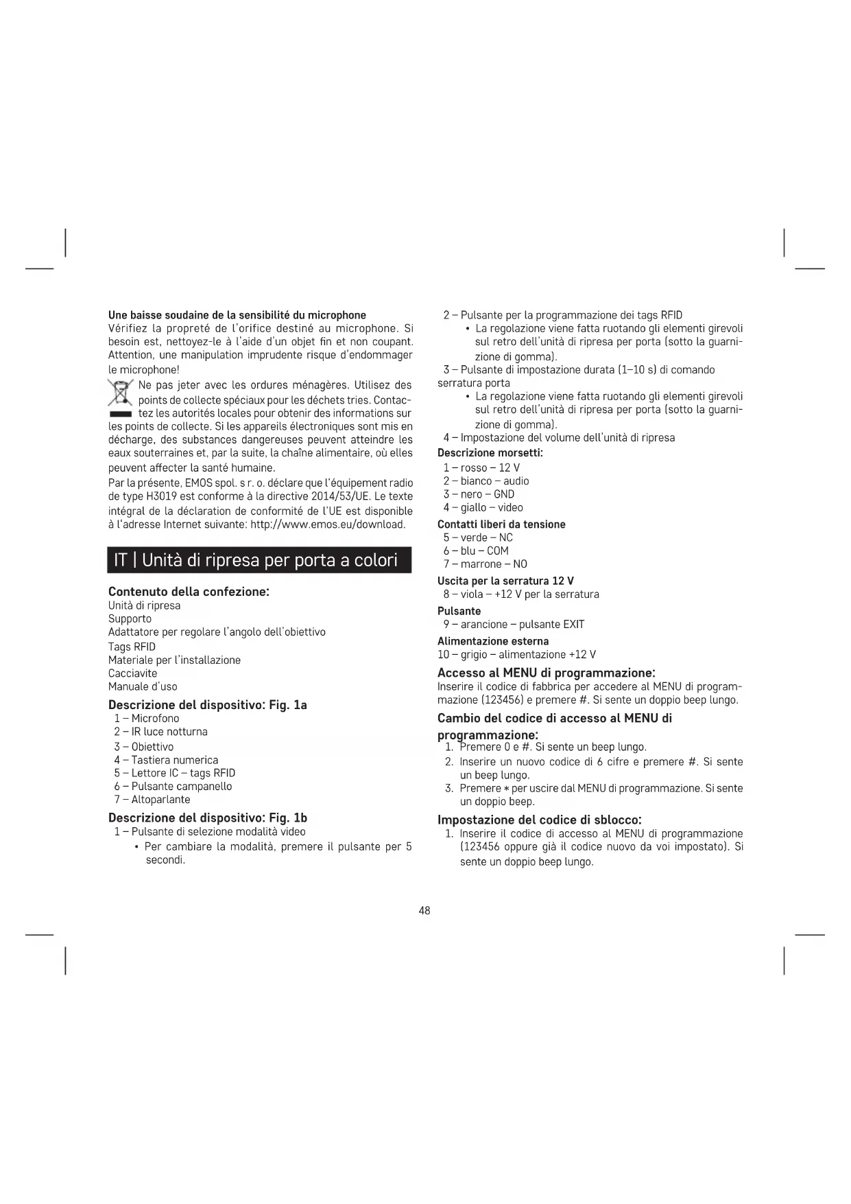 Nella versione base, per la trasmissione video non è necessario un cavo coassiale. Esso è raccomandato per le distanze oltre i 100 m. Per lunghe linee sotterranee può essere usato un cavo per tele- comunicazioni di categoria TCEPKPFLE. Comando base del dispositivo Per suonare il campanello e richiamare l’immagine del videocito- fono dall’unità di ripresa per porta, premere il pulsante sull’unità di ripresa per porta. Il suono proveniente dall’esterno viene trasmesso anche al monitor. Manutenzione del dispositivo Il pannello richiede poca manutenzione. Si consiglia di pulirlo ogni tanto con un panno umido, a seconda del grado di sporcizia. Attenzione! Prima di procedere alla pulizia, il dispositivo deve essere scollegato dall’alimentazione di rete! FAQ Immagine/suono disturbato, dispositivo non suona Staccare il monitor o l’unità di ripresa per porta e collegarli con un cavo corto per escludere l’interruzione delle condutture domestiche. Controllare l’impostazione dei parametri immagine e suono (luminosità, contrasto, colori, volume). Obiettivo si appanna Questo fenomeno si verica soprattutto nei periodi freddi con la formazione della condensa a causa della dierenza di tempera- tura tra la parete e l’unità di ripresa per porta stessa. In caso di condensa si consiglia di asciugare bene l’unità di ripresa per porta e di modicare l’installazione. Suono spontaneo del campanello Il suono spontaneo del campanello è causato dall’ingresso di umidità nell’unità di ripresa per porta. L’acqua provoca il cortocir- cuito tra i contatti dell’interruttore della serratura e il dispositivo suona spontaneamente. Si consiglia di smontare l’unità di ripresa per porta, asciugarla bene e applicare sulla stessa uno spray idrorepellente per appa- recchiature elettroniche. Fischio (retroazione) La retroazione è causata dalla frammentazione del suono in uscita dall’unità di ripresa per porta. Il suono si frammenta e ritorna al microfono nel quale viene ulteriormente amplicato. Questo fenomeno può essere eliminato abbassando la sensibilità del microfono e il volume dell’altoparlante. Per le unità porta dotate di elementi regolabili, tale impostazione può essere fatta ruotando i potenziometri. Per le unità senza regolazione, il microfono può essere silenziato meccanicamente mediante un pezzo di gommapiuma. Serratura non si sblocca Controllare l’integrità delle condutture. Con un multimetro, mi- surare la tensione ai terminali della serratura. Per l’attivazione, la serratura necessita di una tensione di 12 V. In caso di valore più basso, si consiglia di utilizzare per il comando della serratura cavi più robusti.51 Calo improvviso della sensibilità del microfono Controllare che il foro del microfono sia pulito e, se necessario, pulirlo leggermente con un oggetto sottile e smussato. Procedere con cautela per non danneggiare il microfono! Non smaltire con i riuti domestici. Utilizza punti di rac- colta speciali per i riuti dierenziati. Contatta le autorit à locali per informazioni sui punti di raccolta. Se i dispositi- vi elettronici dovessero essere smaltiti in discarica, le sostanze pericolose potrebbero raggiungere le acque sotterranee e, di conseguenza, la catena alimentare, dove potrebbe inuire sulla salute umana. Con la presente, EMOS spol. s r. o. dichiara che l‘apparecchiatura radio tipo H3019 è conforme alla direttiva 2014/53/UE. Il testo completo della dichiarazione di conformità UE è disponibile al seguente indirizzo internet: http://www.emos.eu/download. ES | Unidad de cámara Contenido del paquete: Unidad de cámara Soporte Accesorio para la conguración de ángulo del objetivo Chips RFID Material para la instalación Destornillador Manual Descripción del dispositivo: gura 1a 1 – Micrófono 2 – Luz infrarroja 3 – Objetivo 4 – Teclado numérico 5 – Lector IC: chips RFID 6 – Botón de sonido 7 – Reproductor Descripción del dispositivo: gura 1b 1 – Botón de selección de modo del vídeo