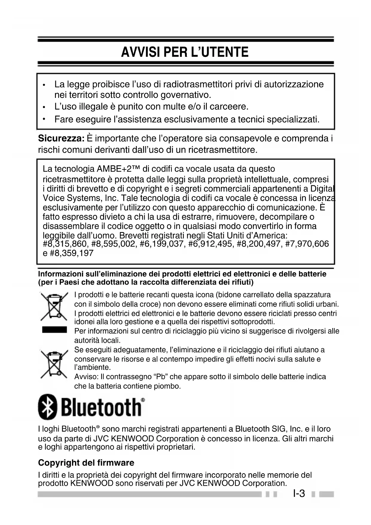 Fare eseguire l’assistenza esclusivamente a tecnici specializzati. Sicurezza: È importante che l’operatore sia consapevole e comprenda i rischi comuni derivanti dall’uso di un ricetrasmettitore. La tecnologia AMBE+2™ di codifi ca vocale usata da questo ricetrasmettitore è protetta dalle leggi sulla proprietà intellettuale, compresi i diritti di brevetto e di copyright e i segreti commerciali appartenenti a Digital Voice Systems, Inc. Tale tecnologia di codifi ca vocale è concessa in licenza esclusivamente per l’utilizzo con questo apparecchio di comunicazione. È fatto espresso divieto a chi la usa di estrarre, rimuovere, decompilare o disassemblare il codice oggetto o in qualsiasi modo convertirlo in forma leggibile dall’uomo. Brevetti registrati negli Stati Uniti d’America: #8,315,860, #8,595,002, #6,199,037, #6,912,495, #8,200,497, #7,970,606 e #8,359,197 Informazioni sull’eliminazione dei prodotti elettrici ed elettronici e delle batterie(per i Paesi che adottano la raccolta differenziata dei rifiuti).I prodotti e le batterie recanti questa icona (bidone carrellato della spazzaturacon il simbolo della croce) non devono essere eliminati come rifiuti solidi urbani.I prodotti elettrici ed elettronici e le batterie devono essere riciclati presso centriidonei alla loro gestione e a quella dei rispettivi sottoprodotti.Per informazioni sul centro di riciclaggio più vicino si suggerisce di rivolgersi alleautorità locali.Se eseguiti adeguatamente, l’eliminazione e il riciclaggio dei rifiuti aiutano aconservare le risorse e al contempo impedire gli effetti nocivi sulla salute el’ambiente.Avviso: Il contrassegno “Pb” che appare sotto il simbolo delle batterie indicache la batteria contiene piombo...I loghi Bluetooth® sono marchi registrati appartenenti a Bluetooth SIG, Inc. e il lorouso da parte di JVC KENWOOD Corporation è concesso in licenza. Gli altri marchie loghi appartengono ai rispettivi proprietari. Copyright del firmware I diritti e la proprietà dei copyright del firmware incorporato nelle memorie delprodotto KENWOOD sono riservati per JVC KENWOOD Corporation. I-3PRECAUZIONI