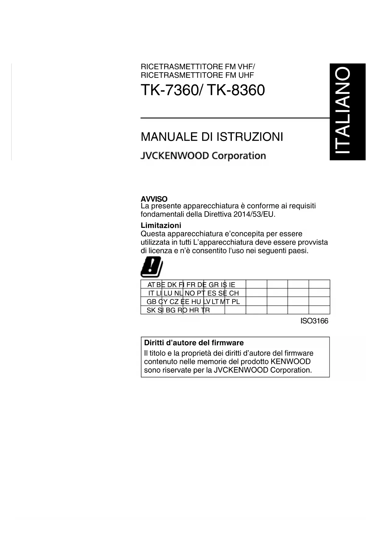 ITALIANO AVVISO La presente apparecchiatura è conforme ai requisiti fondamentali della Direttiva 2014/53/EU. Limitazioni Questa apparecchiatura e’concepita per essere utilizzata in tutti L’apparecchiatura deve essere provvista di licenza e n’è consentito l'uso nei seguenti paesi. AT BE DK FI FR DE GR IS IE IT LI LU NL NO PT ES SE CH GB CY CZ EE HU LV LT MT PL SK SI BG RO HR TR ISO3166 Diritti d’autore del rmware Il titolo e la proprietà dei diritti d’autore del rmware contenuto nelle memorie del prodotto KENWOOD sono riservate per la JVCKENWOOD Corporation.Informazioni sullo smaltimento delle vecchie apparecchiature elettriche ed elettroniche e le batterie (valido per i paesi che hanno adottato sistemi di raccolta separata) I pr odotti e le batterie recanti il simbolo di un contenitore di spazzatura su ruote barrato non possono essere smaltiti insieme ai normali rifiuti di casa. I vecchi prodotti elettrici ed elettronici e le batterie devono essere riciclati presso una apposita struttura in grado di trattare questi prodotti e di smaltirne i loro componenti. Per conoscere dove e come recapitare tali prodotti nel luogo a voi più vicino, contattare l’apposito ufficio comunale. Un appropriato riciclo e smaltimento aiuta a conservare la natura e a prevenire effetti nocivi alla salute e all’ambiente.I-i GRAZIE Vi esprimiamo la nostra gratitudine per aver scelto KENWOOD per le vostre applicazioni mobili. Il presente manuale di istruzioni tratta solo le funzioni di base del vostro apparecchio radiomobile. Per avere maggiori informazioni, o per saperne di più sulle funzioni personalizzate che fossero state aggiunte alla radio, chiedere al proprio rivenditore.
