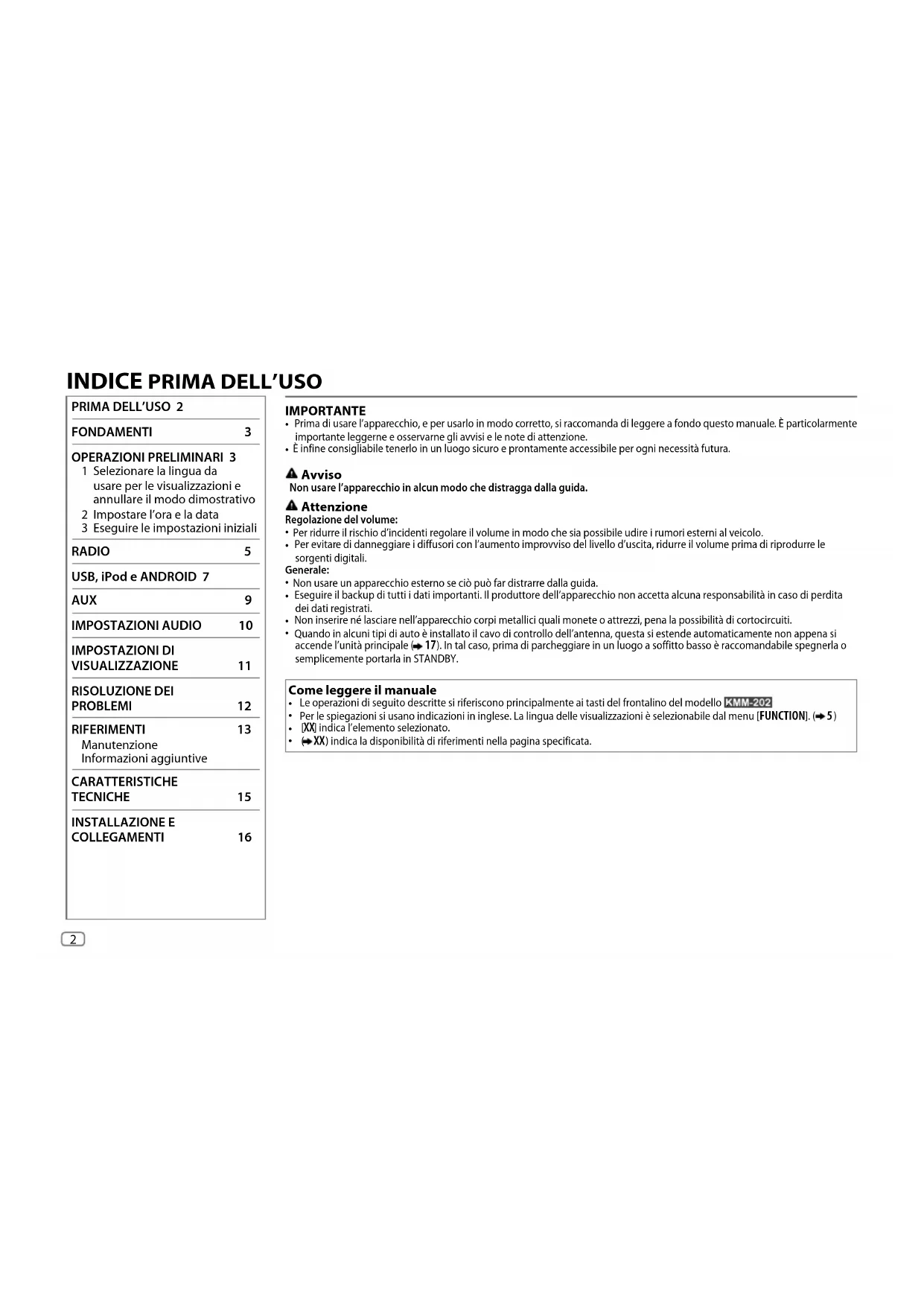 FONDAMENTI 3 OPERAZIONI PRELIMINARI 3 1 Selezionare la lingua da usare per le visualizzazioni e annullare il modo dimostrativo 2 Impostare l’ora e la data 3 Eseguire le impostazioni iniziali RADIO 5 USB, iPod e ANDROID 7 AUX 9 IMPOSTAZIONI AUDIO 10 IMPOSTAZIONI DI VISUALIZZAZIONE 11 RISOLUZIONE DEI PROBLEMI 12 RIFERIMENTI 13 Manutenzione Informazioni aggiuntive CARATTERISTICHE TECNICHE 15 INSTALLAZIONE E COLLEGAMENTI 16 JS_KWD_KMM_202_ENE2N_IT.indd 2JS_KWD_KMM_202_ENE2N_IT.indd 2 20-Aug-15 4:46:17 PM20-Aug-15 4:46:17 PMData Size: B6L (182 mm x 128 mm) Book Size: B6L (182 mm x 128 mm)