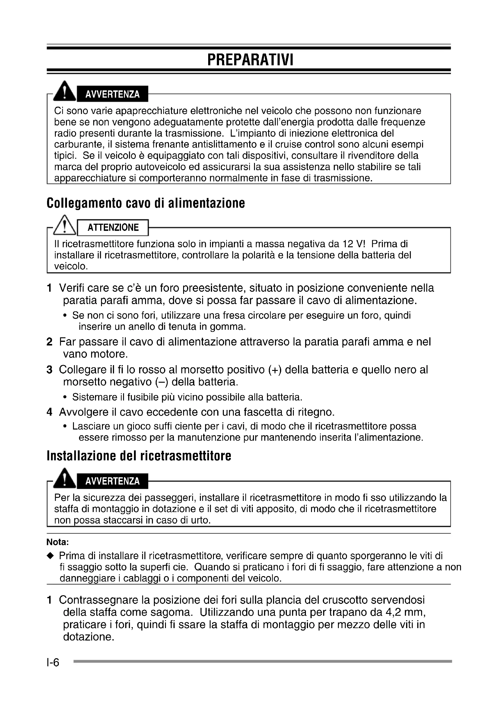 - Rondella piatta. . . . . . . . . . . . . . . . . . . . . . . . . . . . . . . . . . . . . . . . . . . . . . . . . . . . . . 4 Guida per l'utente . . . . . . . . . . . . . . . . . . . . . . . . . . . . . . . . . . . . . . . . . . . . . . 1I-6 PREPARATIVI AVVERTENZA Ci sono varie apaprecchiature elettroniche nel veicolo che possono non funzionare bene se non vengono adeguatamente protette dall’energia prodotta dalle frequenze radio presenti durante la trasmissione. L’impianto di iniezione elettronica del carburante, il sistema frenante antislittamento e il cruise control sono alcuni esempi tipici. Se il veicolo è equipaggiato con tali dispositivi, consultare il rivenditore della marca del proprio autoveicolo ed assicurarsi la sua assistenza nello stabilire se tali apparecchiature si comporteranno normalmente in fase di trasmissione. Collegamento cavo di alimentazione ATTENZIONE Il ricetrasmettitore funziona solo in impianti a massa negativa da 12 V! Prima di installare il ricetrasmettitore, controllare la polarità e la tensione della batteria del veicolo. 1 Verifi care se c’è un foro preesistente, situato in posizione conveniente nella paratia parafi amma, dove si possa far passare il cavo di alimentazione.