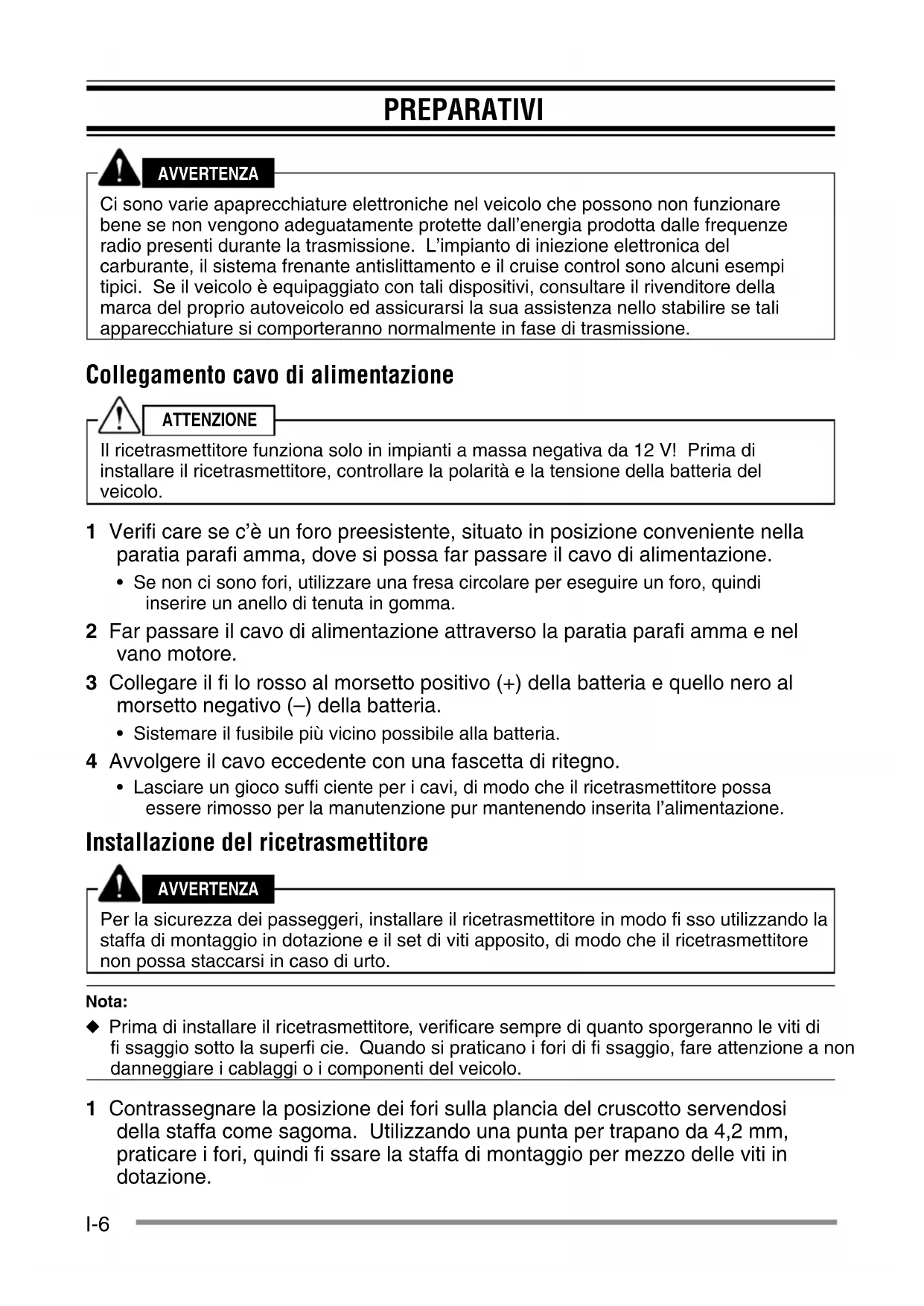 - L’eliminazione delle batterie deve avvenire nel rispetto delle leggi e dei regolamenti in vigore nel proprio paese e regione. ATTENZIONE ◆ Il ricetrasmettitore funziona solo in impianti a massa negativa da 12 V! Prima di installare il ricetrasmettitore, controllare la polarità e la tensione della batteria del veicolo. ◆ Utilizzare esclusivamente il cavo di alimentazione c.c. in dotazione o un cavo di alimentazione opzionale KENWOOD. ◆ Non tagliare e/o togliere il portafusibile sul cavo di alimentazione c.c. ◆ Non mettere il cavo del microfono attorno al collo quando ci si trova in prossimità di macchinari che potrebbero afferrare il cavo. AVVERTENZA Per la sicurezza dei passeggeri, installare il ricetrasmettitore in modo fi sso utilizzando la staffa di montaggio in dotazione e il set di viti apposito, di modo che il ricetrasmettitore non possa staccarsi in caso di urto.I-5