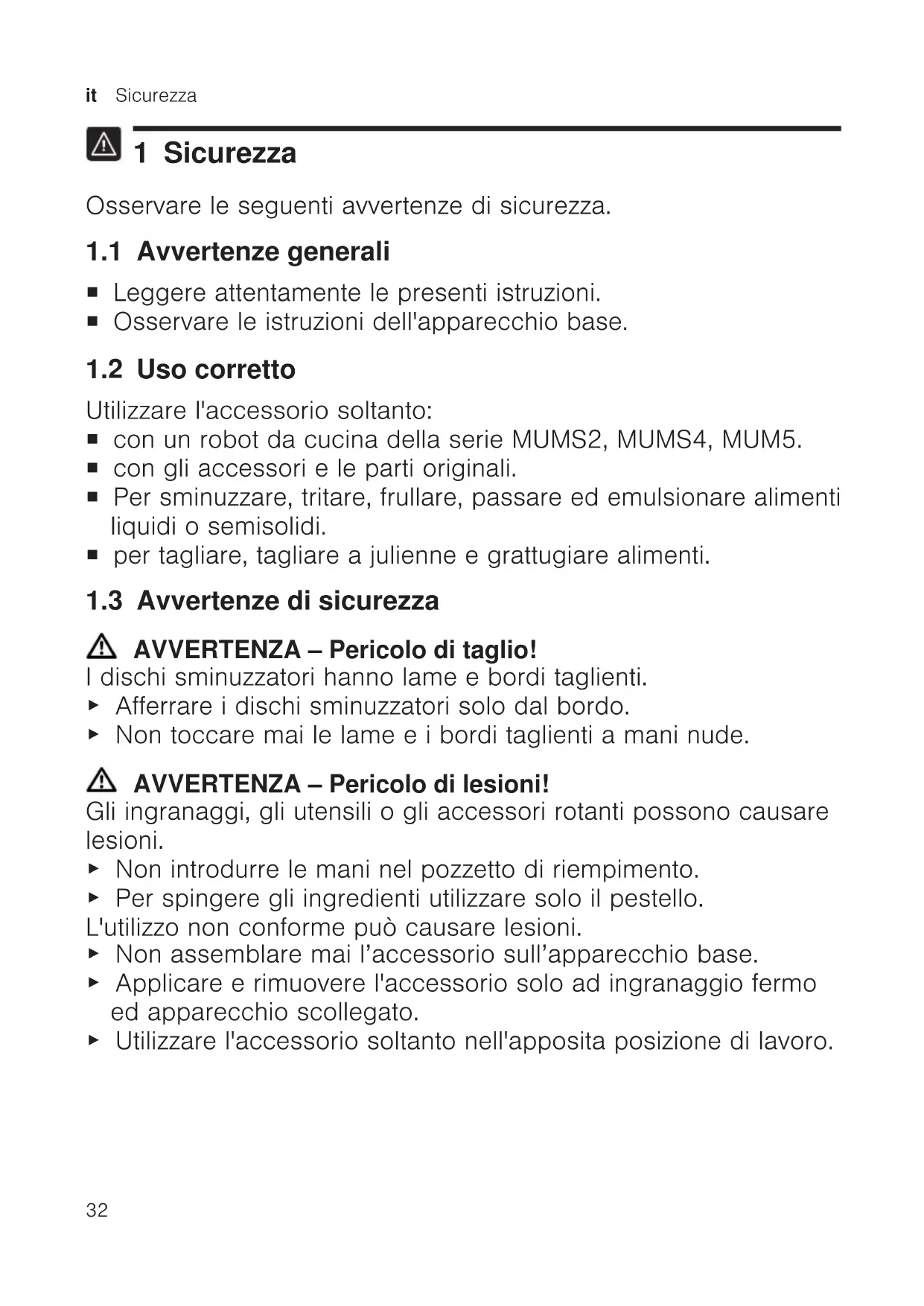 1 Sicurezza Osservare le seguenti avvertenze di sicurezza. 1.1 Avvertenze generali ¡ Leggere attentamente le presenti istruzioni. ¡ Osservare le istruzioni dell'apparecchio base. 1.2 Uso corretto Utilizzare l'accessorio soltanto: ¡ con un robot da cucina della serie MUMS2, MUMS4, MUM5. ¡ con gli accessori e le parti originali. ¡ Per sminuzzare, tritare, frullare, passare ed emulsionare alimenti liquidi o semisolidi. ¡ per tagliare, tagliare a julienne e grattugiare alimenti. 1.3 Avvertenze di sicurezza AVVERTENZA‒Pericolo di taglio! I dischi sminuzzatori hanno lame e bordi taglienti. ▶ Afferrare i dischi sminuzzatori solo dal bordo. ▶ Non toccare mai le lame e i bordi taglienti a mani nude. AVVERTENZA‒Pericolo di lesioni! Gli ingranaggi, gli utensili o gli accessori rotanti possono causare lesioni. ▶ Non introdurre le mani nel pozzetto di riempimento. ▶ Per spingere gli ingredienti utilizzare solo il pestello. L'utilizzo non conforme può causare lesioni. ▶ Non assemblare mai l’accessorio sull’apparecchio base. ▶ Applicare e rimuovere l'accessorio solo ad ingranaggio fermo ed apparecchio scollegato. ▶ Utilizzare l'accessorio soltanto nell'apposita posizione di lavoro.Prevenzione di danni materiali it
