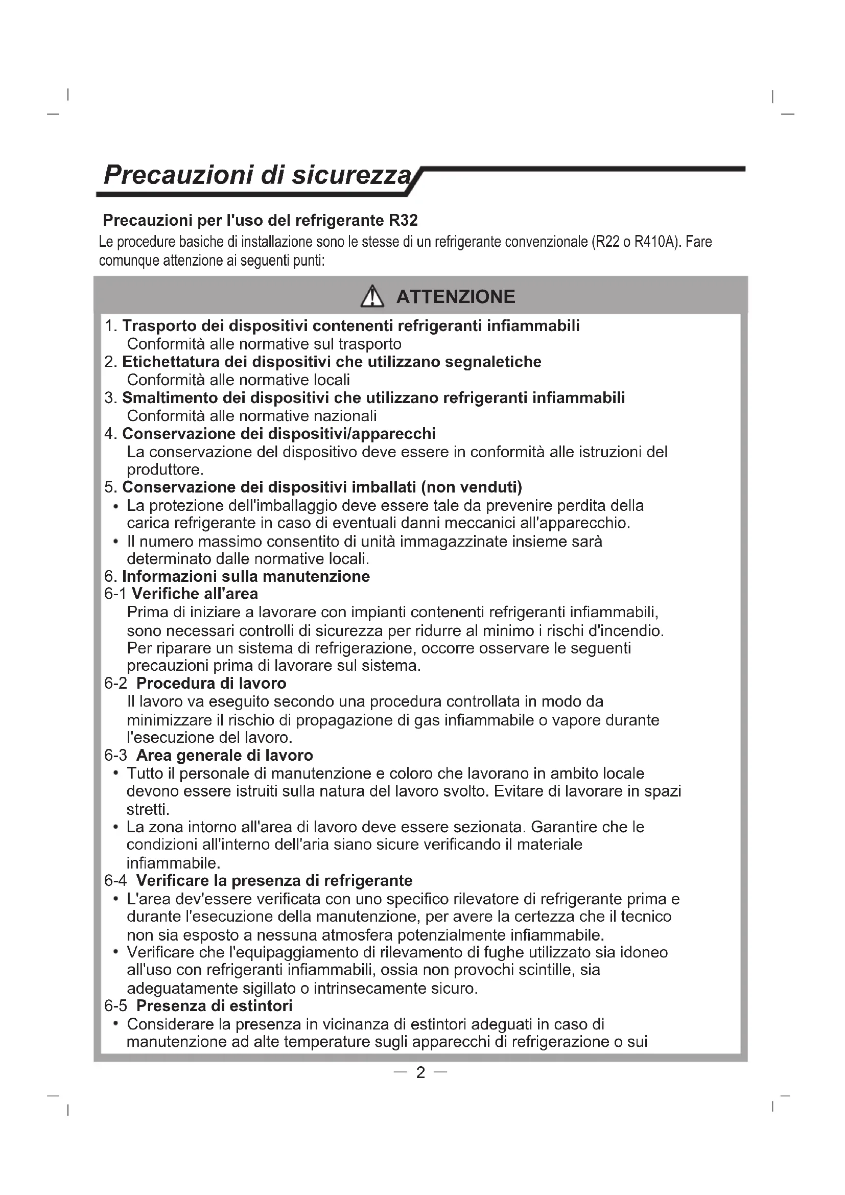 6-1 Verifiche all'area Prima di iniziare a lavorare con impianti contenenti refrigeranti infiammabili, sono necessari controlli di sicurezza per ridurre al minimo i rischi d'incendio. Per riparare un sistema di refrigerazione, occorre osservare le seguenti precauzioni prima di lavorare sul sistema. 6-2 Procedura di lavoro Il lavoro va eseguito secondo una procedura controllata in modo da minimizzare il rischio di propagazione di gas infiammabile o vapore durante l'esecuzione del lavoro. 6-3 Area generale di lavoro Tutto il personale di manutenzione e coloro che lavorano in ambito locale devono essere istruiti sulla natura del lavoro svolto. Evitare di lavorare in spazi stretti. La zona intorno all'area di lavoro deve essere sezionata. Garantire che le condizioni all'interno dell'aria siano sicure verificando il materiale infiammabile. 6-4 Verificare la presenza di refrigerante L'area dev'essere verificata con uno specifico rilevatore di refrigerante prima e durante l'esecuzione della manutenzione, per avere la certezza che il tecnico non sia esposto a nessuna atmosfera potenzialmente infiammabile. Verificare che l'equipaggiamento di rilevamento di fughe utilizzato sia idoneo all'uso con refrigeranti infiammabili, ossia non provochi scintille, sia adeguatamente sigillato o intrinsecamente sicuro. 6-5 Presenza di estintori Considerare la presenza in vicinanza di estintori adeguati in caso di manutenzione ad alte temperature sugli apparecchi di refrigerazione o suiPrecauzioni di sicurezza