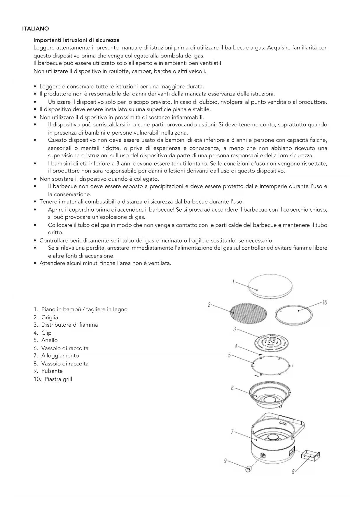 KEEP YOUNG CHILDEREN AWAY. This appliance must be kept away from flammable materials during use. Do not move the appliance during use. Turn off the gas supply at the gas cylinder after use. Do not modify the appliance. 0063DANSKImportanti istruzioni di sicurezza Leggere attentamente il presente manuale di istruzioni prima di utilizzare il barbecue a gas. Acquisire familiarità con questo dispositivo prima che venga collegato alla bombola del gas. Il barbecue può essere utilizzato solo all'aperto e in ambienti ben ventilati! Non utilizzare il dispositivo in roulotte, camper, barche o altri veicoli.