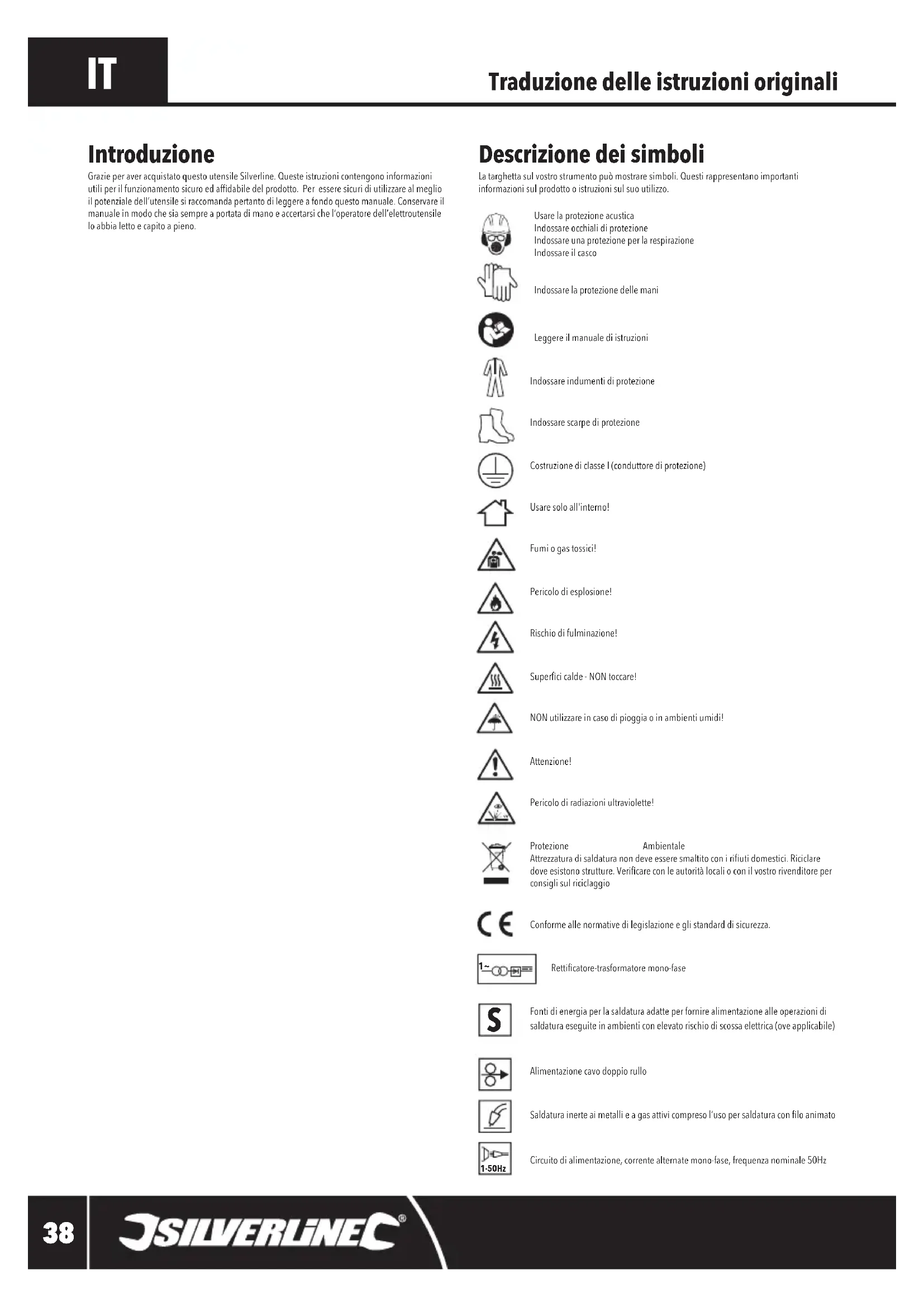 Traduzione delle istruzioni originali Introduzione Grazie per aver acquistato questo utensile Silverline. Queste istruzioni contengono informazioni utili per il funzionamento sicuro ed afdabile del prodotto. Per essere sicuri di utilizzare al meglio il potenziale dell’utensile si raccomanda pertanto di leggere a fondo questo manuale. Conservare il manuale in modo che sia sempre a portata di mano e accertarsi che l’operatore dell’elettroutensile lo abbia letto e capito a pieno. Descrizione dei simboli La targhetta sul vostro strumento può mostrare simboli. Questi rappresentano importanti informazioni sul prodotto o istruzioni sul suo utilizzo. Usare la protezione acusticaIndossare occhiali di protezioneIndossare una protezione per la respirazioneIndossare il cascoIndossare la protezione delle maniLeggere il manuale di istruzioniIndossare indumenti di protezioneIndossare scarpe di protezioneCostruzione di classe I (conduttore di protezione)Usare solo all'interno!Fumi o gas tossici!Pericolo di esplosione!Rischio di fulminazione!Superci calde - NON toccare!NON utilizzare in caso di pioggia o in ambienti umidi!Attenzione!Pericolo di radiazioni ultraviolette!Protezione Ambientale Attrezzatura di saldatura non deve essere smaltito con i riuti domestici. Riciclare dove esistono strutture. Vericare con le autorità locali o con il vostro rivenditore per consigli sul riciclaggioConforme alle normative di legislazione e gli standard di sicurezza. Retticatore-trasformatore mono-faseFonti di energia per la saldatura adatte per fornire alimentazione alle operazioni di saldatura eseguite in ambienti con elevato rischio di scossa elettrica (ove applicabile)Alimentazione cavo doppio rulloSaldatura inerte ai metalli e a gas attivi compreso l’uso per saldatura con lo animatoCircuito di alimentazione, corrente alternate mono-fase, frequenza nominale 50Hz