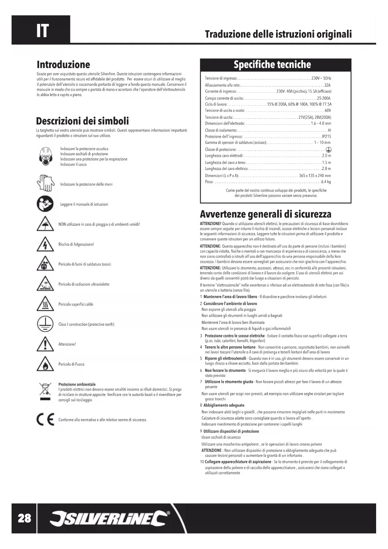 Avvertenze generali di sicurezza ATTENZIONE! Quando si utilizzano utensili elettrici, le precauzioni di sicurezza di base dovrebbero essere sempre seguite per ridurre il rischio di incendi, scosse elettriche e lesioni personali incluse le seguenti informazioni di sicurezza. Leggere tutte le istruzioni prima di utilizzare il prodotto e conservare queste istruzioni per un utilizzo futuro. ATTENZIONE: Questo apparecchio non è destinato all'uso da parte di persone (inclusi i bambini) con capacità ridotta, siche o mentali o con mancanza di esperienza o di conoscenza, a meno che non siano controllati o istruiti all'uso dell'apparecchio da una persona responsabile della loro sicurezza. I bambini devono essere sorvegliati per assicurarsi che non giochino con l'apparecchio. ATTENZIONE: Utilizzare lo strumento, accessori, attrezzi, ecc in conformità alle presenti istruzioni, tenendo conto delle condizioni di lavoro e il lavoro da svolgere. L’uso di utensili elettrici per usi diversi da quelli consentiti potrà dar luogo a situazioni di pericolo.Il termine “elettroutensile” nelle avvertenze si riferisce ad un elettroutensile di rete ssa (con lo) o un utensile a batteria (senza lo).1 Mantenere l'area di lavoro libero - Il disordine e panchine invitano gli infortuni2 Considerare l'ambiente di lavoro Non esporre gli utensili alla pioggia Non utilizzare gli strumenti in luoghi umidi o bagnati Mantenere l'area di lavoro ben illuminata Non usare utensili in presenza di liquidi o gas inammabili 3 Protezione contro le scosse elettriche - Evitare il contatto sico con superci collegate a terra (p.es. tubi, caloriferi, fornelli, frigoriferi) 4 Tenere le altre persone lontane - Non consentire a persone, soprattutto bambini, non coinvolti nei lavori toccare l'utensile o il cavo di prolunga e tenerli lontani dall'area di lavoro 5 Riporre gli elettroutensili - Quando non è in uso, gli strumenti devono essere conservati in un luogo chiuso a chiave asciutto, fuori dalla portata dei bambini 6 Non forzare lo strumento - Si eseguirà il lavoro meglio e più sicuro alla velocità per la quale è stato previsto 7 Utilizzare lo strumento giusto - Non forzare piccoli attrezzi per fare il lavoro di un attrezzo pesante Non usare utensili per scopi non previsti, ad esempio non utilizzare seghe circolari per tagliare grossi tronchi8 Abbigliamento adeguato Non indossare abiti larghi o gioielli , che possono rimanere impigliati nelle parti in movimento Calzature di sicurezza adatte sono consigliate quando si lavora all'aperto . Indossare rivestimento di protezione per contenere i capelli lunghi9 Utilizzare dispositivi di protezione Usare occhiali di sicurezza Utilizzare una mascherina antipolvere , se le operazioni di lavoro creano polvere ATTENZIONE : Non utilizzare dispositivi di protezione o abbigliamento adeguato che può causare lesioni personali o aumentare la gravità di un infortunio . 10 Collegare apparecchiature di aspirazione - Se lo strumento è previsto per il collegamento di aspirazione della polvere e di raccolta delle apparecchiature , assicurarsi che siano collegati e utilizzati correttamente Traduzione delle istruzioni originali Descrizioni dei simboli La targhetta sul vostro utensile può mostrare simboli. Questi rappresentano informazioni importanti riguardanti il prodotto o istruzioni sul suo utilizzo.Indossare la protezione acusticaIndossare occhiali di protezioneIndossare una protezione per la respirazioneIndossare il cascoIndossare la protezione delle maniLeggere il manuale di istruzioniNON utilizzare in caso di pioggia o di ambienti umidi!Rischio di folgorazione!Pericolo di fumi di saldatura tossiciPericolo di radiazioni ultraviolettePericolo superci calde Class I construction (protective earth)Attenzione!Pericolo di FuocoProtezione ambientale I prodotti elettrici non devono essere smaltiti insieme ai riuti domestici. Si prega di riciclare in strutture apposite. Vericare con le autorità locali o il rivenditore per consigli sul riciclaggioConforme alla normativa e alle relative norme di sicurezza. Introduzione Grazie per aver acquistato questo utensile Silverline. Queste istruzioni contengono informazioni utili per il funzionamento sicuro ed afdabile del prodotto. Per essere sicuri di utilizzare al meglio il potenziale dell’utensile si raccomanda pertanto di leggere a fondo questo manuale. Conservare il manuale in modo che sia sempre a portata di mano e accertarsi che l’operatore dell’elettroutensile lo abbia letto e capito a pieno.