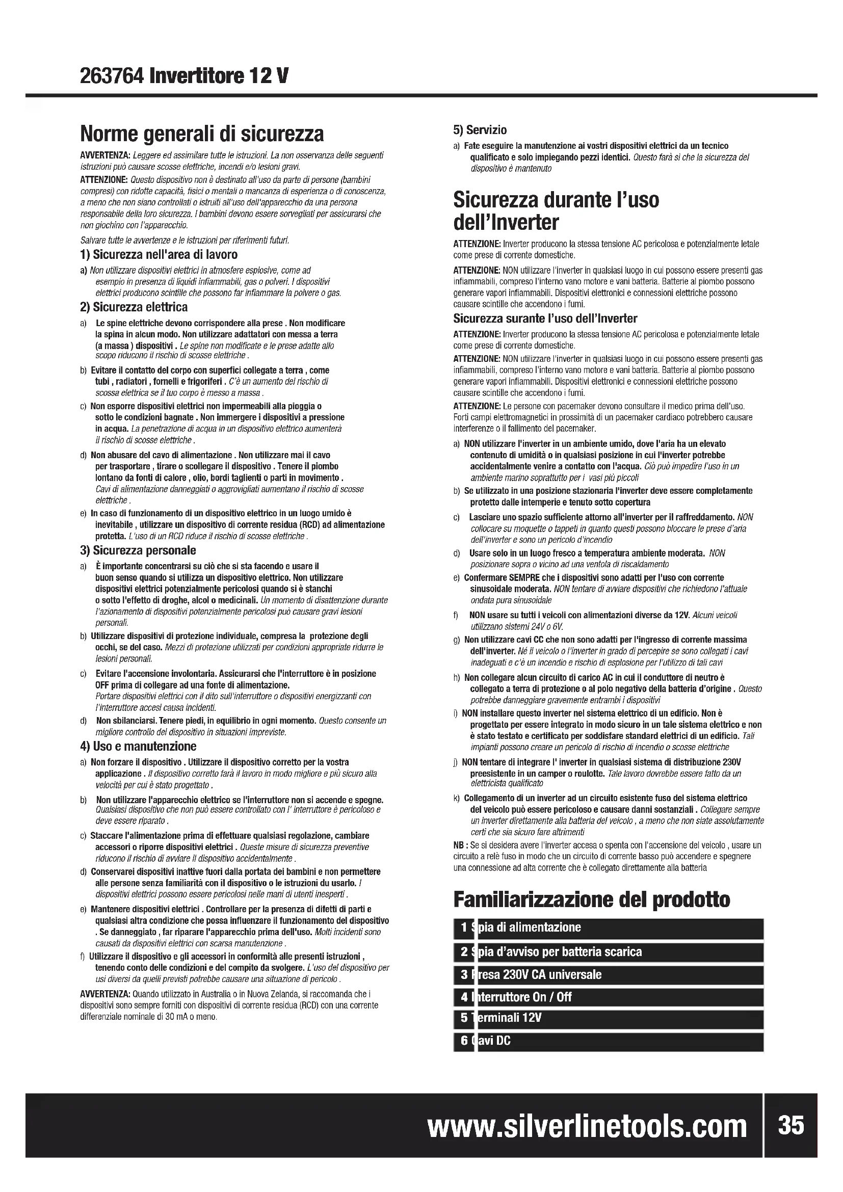 Descrizione dei simboli La targhetta sul vostro strumento può mostrare simboli. Questi rappresentano importanti informazioni sul prodotto o le istruzioni per il suo utilizzo. Indossare protezioni per l’uditoIndossare protezioni per gli occhiIndossare una protezione per le vie respiratorieIndossare protezione della testa Indossare protezioni per le mani Leggere il manual di istruzioniSolo per l’uso interno NON utilizzare in caso di pioggia o in ambienti umidi!Attenzione!Rischio di fulminazione!Conforme alla legislazione e alle norme di sicurezza Protezione Ambientale Gli apparecchi elettrici non devono essere smaltiti con i rifiuti domestici. Riciclare dove esistono strutture. Verificare con le autorità locali o il rivenditore per un consiglio sul riciclaggio. T-130˚ Specifiche Tecniche Rango de tensión de entrada ......................... 10 – 15 V, CC Tensión de entrada ........................................70A (picco 140A , un ......................................................................secondo) Tensión de salida ........................................... 230 V, 50 Hz Forma de onda ..............................................Sinusoidal modificada Toma de corriente .......................................... Universal Potencia máxima continua de salida ..............700 W Capacidad/tiempo de sobretensión ................ 1400 W, durante 1 ..................................................................... segundo Rendimiento .................................................. >88 % Intensidad de corriente sin carga ................... <0,6 A Apagado por baja tensión .............................. 10 ±0,5 V Fusible (12 V) ................................................. 40 A, tipo plano Temperatura de funcionamiento recomendada ..................................................................... 10 - 27° C Funciones de protección ................................ Sobretensión en la ..................................................................... entrada (16 V) ..................................................................... Bajadas de tensión en ..................................................................... la entrada ..................................................................... Sobrecarga en la salida ..................................................................... Cortocircuito en la ..................................................................... salida ..................................................................... Sobrecalentamiento ..................................................................... (65˚ C) Temperatura máxima de funcionamiento....... 65° C Dimensiones (A x L x An) ...............................60 x 205 x 105 mm Peso ..............................................................0,95 kg Come parte del nostro continuo sviluppo del prodotto, le specifiche dei prodotti Silverline possono variare senza preavviso. V Volt ~ Corrente alternata A Ampere Hz Hertz W, kW Watt, kilowatt Ah Ora ampere Traduzione delle istruzioni originali Introduzione Grazie per aver acquistato questo utensile Silverline. Queste istruzioni contengono informazioni utili per il funzionamento sicuro ed affidabile del prodotto. Per essere sicuri di utilizzare al meglio il potenziale dell’utensile si raccomanda pertanto di leggere a fondo questo manuale. Conservare il manuale in modo che sia sempre a portata di mano e accertarsi che l’operatore dell’elettroutensile lo abbia letto e capito a pieno. 263764_Z1MANPRO1.indd 34 23/11/2016 16:225) Servizio a) Fate eseguire la manutenzione ai vostri dispositivi elettrici da un tecnico qualificato e solo impiegando pezzi identici. Questo farà sì che la sicurezza del dispositivo è mantenuto Sicurezza durante l’uso dell’Inverter ATTENZIONE: Inverter producono la stessa tensione AC pericolosa e potenzialmente letale come prese di corrente domestiche. ATTENZIONE: NON utilizzare l'inverter in qualsiasi luogo in cui possono essere presenti gas infiammabili, compreso l'interno vano motore e vani batteria. Batterie al piombo possono generare vapori infiammabili. Dispositivi elettronici e connessioni elettriche possono causare scintille che accendono i fumi. Sicurezza surante l’uso dell’Inverter ATTENZIONE: Inverter producono la stessa tensione AC pericolosa e potenzialmente letale come prese di corrente domestiche. ATTENZIONE: NON utilizzare l'inverter in qualsiasi luogo in cui possono essere presenti gas infiammabili, compreso l'interno vano motore e vani batteria. Batterie al piombo possono generare vapori infiammabili. Dispositivi elettronici e connessioni elettriche possono causare scintille che accendono i fumi. ATTENZIONE: Le persone con pacemaker devono consultare il medico prima dell'uso. Forti campi elettromagnetici in prossimità di un pacemaker cardiaco potrebbero causare interferenze o il fallimento del pacemaker.a) NON utilizzare l'inverter in un ambiente umido, dove l'aria ha un elevato contenuto di umidità o in qualsiasi posizione in cui l'inverter potrebbe accidentalmente venire a contatto con l'acqua. Ciò può impedire l'uso in un ambiente marino soprattutto per i vasi più piccoli b) Se utilizzato in una posizione stazionaria l'inverter deve essere completamente protetto dalle intemperie e tenuto sotto copertura c) Lasciare uno spazio sufficiente attorno all'inverter per il raffreddamento. NON collocare su moquette o tappeti in quanto questi possono bloccare le prese d’aria dell'inverter e sono un pericolo d'incendio d) Usare solo in un luogo fresco a temperatura ambiente moderata. NON posizionare sopra o vicino ad una ventola di riscaldamento e) Confermare SEMPRE che i dispositivi sono adatti per l'uso con corrente sinusoidale moderata. NON tentare di avviare dispositivi che richiedono l'attuale ondata pura sinusoidale f) NON usare su tutti i veicoli con alimentazioni diverse da 12V. Alcuni veicoli utilizzano sistemi 24V o 6V. g) Non utilizzare cavi