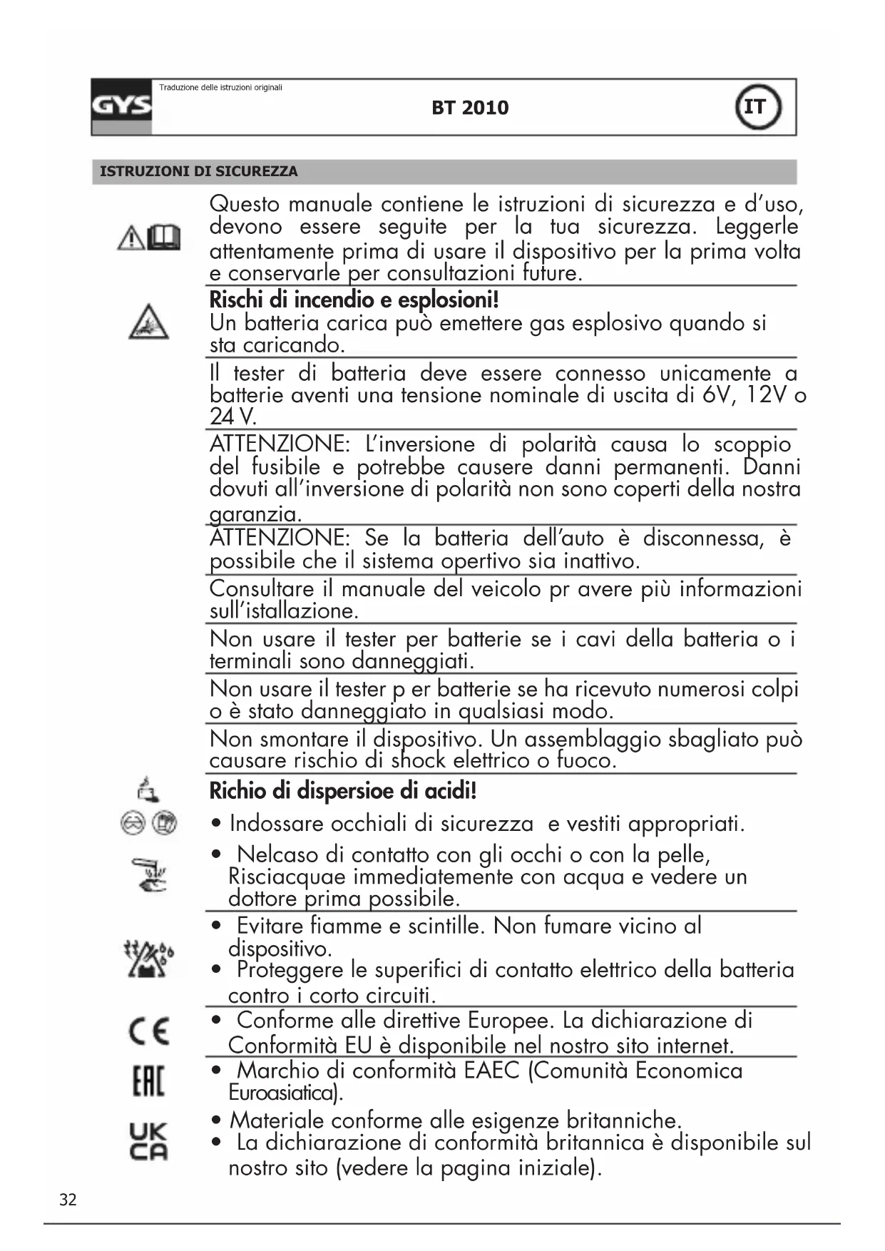 - Gebreken ten gevolge van de gebruiksomgeving (vervuiling, roest, stof). In geval van storing moet het apparaat teruggestuurd worden naar uw distributeur, samen met: - Een gedateerd aankoopbewijs (betaalbewijs, factuur ...). - Een beschrijving van de storing.ISTRUZIONI DI SICUREZZA Questo manuale contiene le istruzioni di sicurezza e d’uso, devono essere seguite per la tua sicurezza. Leggerle attentamente prima di usare il dispositivo per la prima volta e conservarle per consultazioni future. Rischi di incendio e esplosioni! Un batteria carica può emettere gas esplosivo quando si sta caricando. Il tester di batteria deve essere connesso unicamente a batterie aventi una tensione nominale di uscita di 6V, 12V o 24 V. ATTENZIONE: L’inversione di polarità causa lo scoppio del fusibile e potrebbe causere danni permanenti. Danni dovuti all’inversione di polarità non sono coperti della nostra garanzia. ATTENZIONE: Se la batteria dell’auto è disconnessa, è possibile che il sistema opertivo sia inattivo. Consultare il manuale del veicolo pr avere più informazioni sull’istallazione. Non usare il tester per batterie se i cavi della batteria o i terminali sono danneggiati. Non usare il tester p er batterie se ha ricevuto numerosi colpi o è stato danneggiato in qualsiasi modo. Non smontare il dispositivo. Un assemblaggio sbagliato può causare rischio di shock elettrico o fuoco. Richio di dispersioe di acidi!