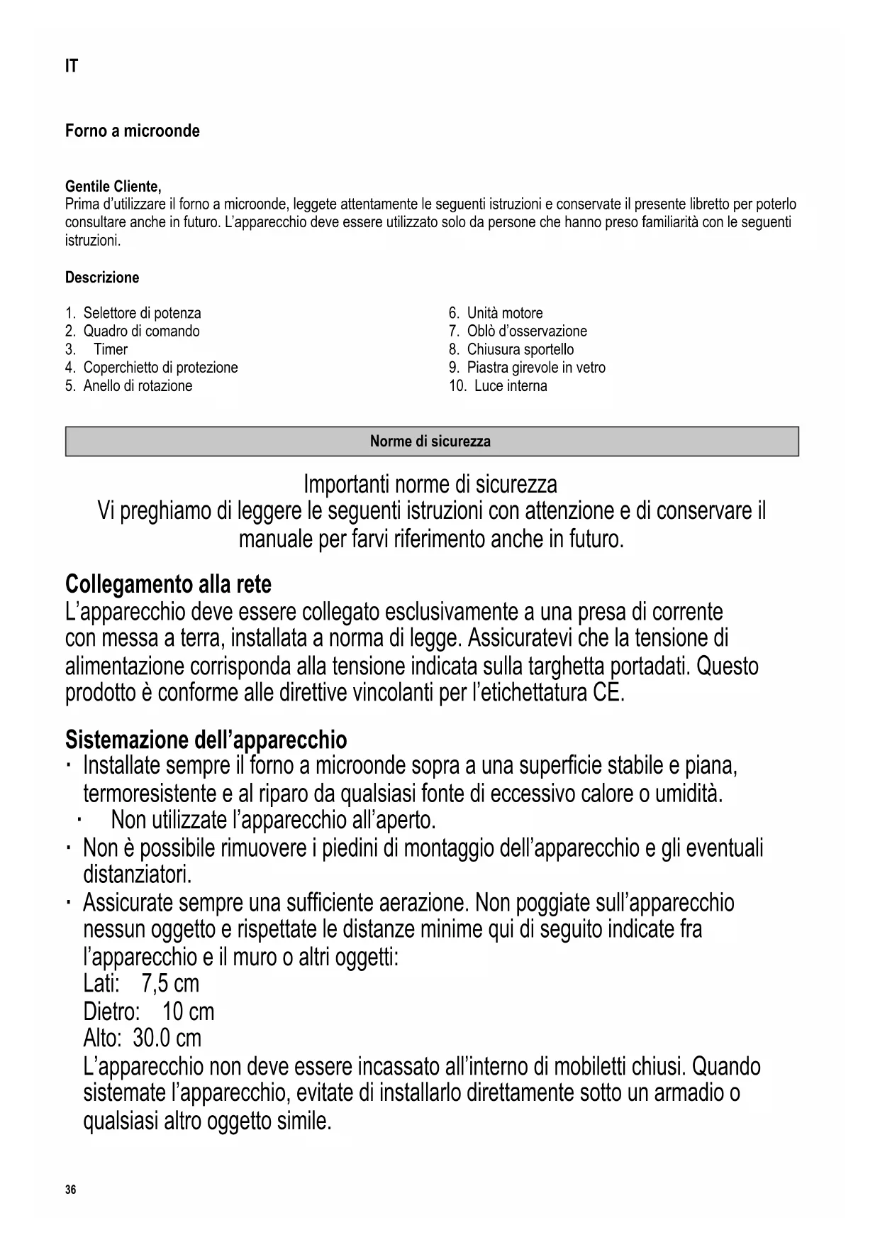Norme di sicurezza Importanti norme di sicurezza Vi preghiamo di leggere le seguenti istruzioni con attenzione e di conservare il manuale per farvi riferimento anche in futuro. Collegamento alla rete L’apparecchio deve essere collegato esclusivamente a una presa di corrente con messa a terra, installata a norma di legge. Assicuratevi che la tensione di alimentazione corrisponda alla tensione indicata sulla targhetta portadati. Questo prodotto è conforme alle direttive vincolanti per l’etichettatura CE. Sistemazione dell’apparecchio ∙ Installate sempre il forno a microonde sopra a una supercie stabile e piana, termoresistente e al riparo da qualsiasi fonte di eccessivo calore o umidità. ∙ Non utilizzate l’apparecchio all’aperto. ∙ Non è possibile rimuovere i piedini di montaggio dell’apparecchio e gli eventuali distanziatori. ∙ Assicurate sempre una sufciente aerazione. Non poggiate sull’apparecchio nessun oggetto e rispettate le distanze minime qui di seguito indicate fra l’apparecchio e il muro o altri oggetti: Lati: 7,5 cm Dietro: 10 cm Alto: 30.0 cm L’apparecchio non deve essere incassato all’interno di mobiletti chiusi. Quando sistemate l’apparecchio, evitate di installarlo direttamente sotto un armadio o qualsiasi altro oggetto simile.37 142 x 208 mm Consigli utili ∙ Avvertenza: Alcuni alimenti possono prendere fuoco. Non lasciate l’apparecchio senza sorveglianza quando è in funzione. ∙ Questo forno a microonde è stato progettato esclusivamente per lo scongelamento, il riscaldamento e la cottura degli alimenti. Avvertenza: Ogni tentativo di riscaldare cibi secchi o capi di abbigliamento, cuscinetti scaldini, pantofole, spugne, stronacci bagnati ecc.: può essere causa di infortunio, fuoco o incendio. ∙ Nessuna responsabilità verrà assunta in caso di danni risultanti da un uso erroneo o dalla non conformità alle istruzioni. ∙ Utilizzate solo utensili da cucina adatti all’uso con le microonde. Durante il funzionamento a microonde non è possibile utilizzare contenitori in metallo per riscaldare cibi e bevande. Per maggiori informazioni, consultate la sezione “Utilizzate sempre utensili da cucina idonei”. ∙ L’apparecchio non è previsto per l’utilizzo con un timer esterno o con un sistema separato di comando a distanza. ∙ Il presente apparecchio può essere usato da bambini (di almeno 8 anni di età) e da persone con ridotte capacità siche, sensoriali o mentali, o da persone senza particolari esperienze o conoscenze, purché siano sotto sorveglianza o siano state date loro istruzioni sull’uso dell’apparecchio e comprendano pienamente i rischi e le precauzioni di sicurezza che l’apparecchio comporta. ∙ Ai bambini non deve essere consentito di giocare con l’apparecchio. ∙ Ai bambini non deve essere consentito di effettuare lavori di pulitura o di manutenzione dell’apparecchio senza la supervisione di un adulto. ∙ L’apparecchio e il cavo di alimentazione devono essere tenuti sempre fuori della portata di bambini di età inferiore agli 8 anni. ∙ Per evitare ogni rischio di scossa elettrica, non pulite l’apparecchio con acqua e non immergetelo in acqua. ∙ Non pulite l’apparecchio utilizzando delle idropulitrici. ∙ Spegnete sempre l’apparecchio e disinserite la spina dalla presa di corrente: - durante ogni pulizia, - in caso di cattivo funzionamento. - dopo ogni uso. ∙ Per disinserire la spina dalla presa di corrente, non tirate mai il cavo di alimentazione ma afferrate direttamente la spina. Non toccate la spina di alimentazione con le mani umide.