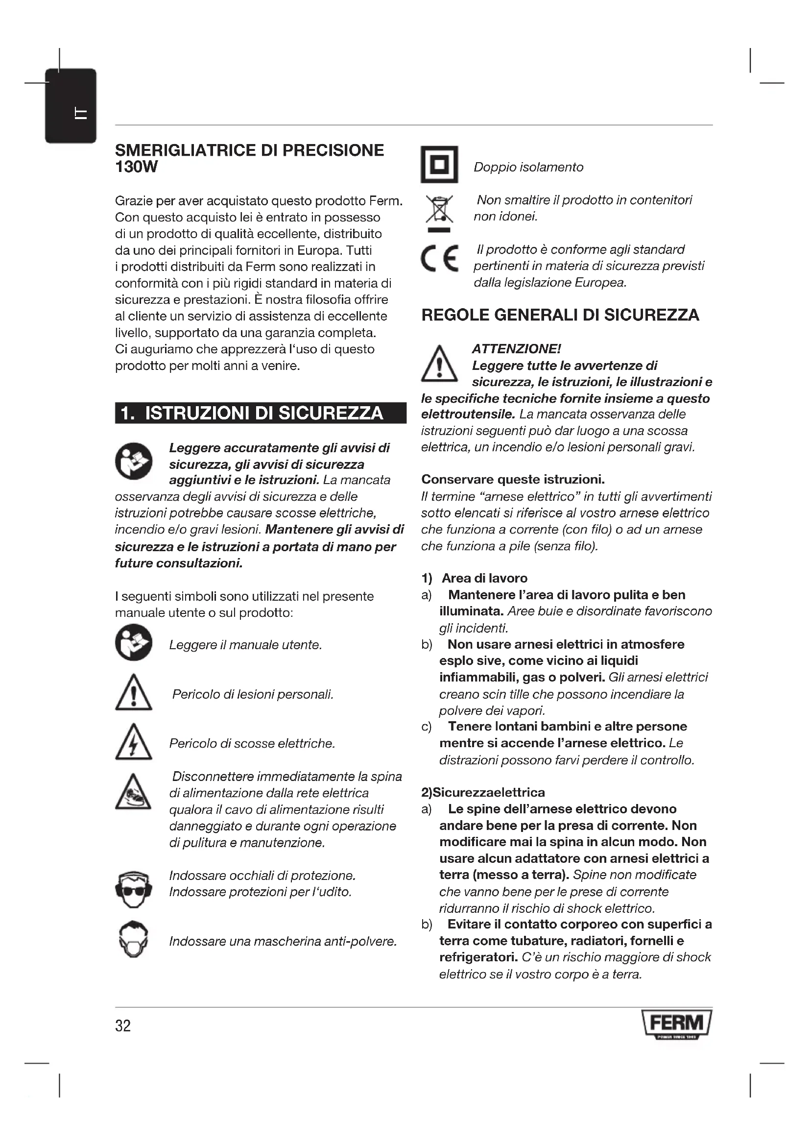 130W Grazie per aver acquistato questo prodotto Ferm. Con questo acquisto lei è entrato in possesso di un prodotto di qualità eccellente, distribuito da uno dei principali fornitori in Europa. Tutti i prodotti distribuiti da Ferm sono realizzati in conformità con i più rigidi standard in materia di sicurezza e prestazioni. È nostra filosofia offrire al cliente un servizio di assistenza di eccellente livello, supportato da una garanzia completa. Ci auguriamo che apprezzerà l‘uso di questo prodotto per molti anni a venire.