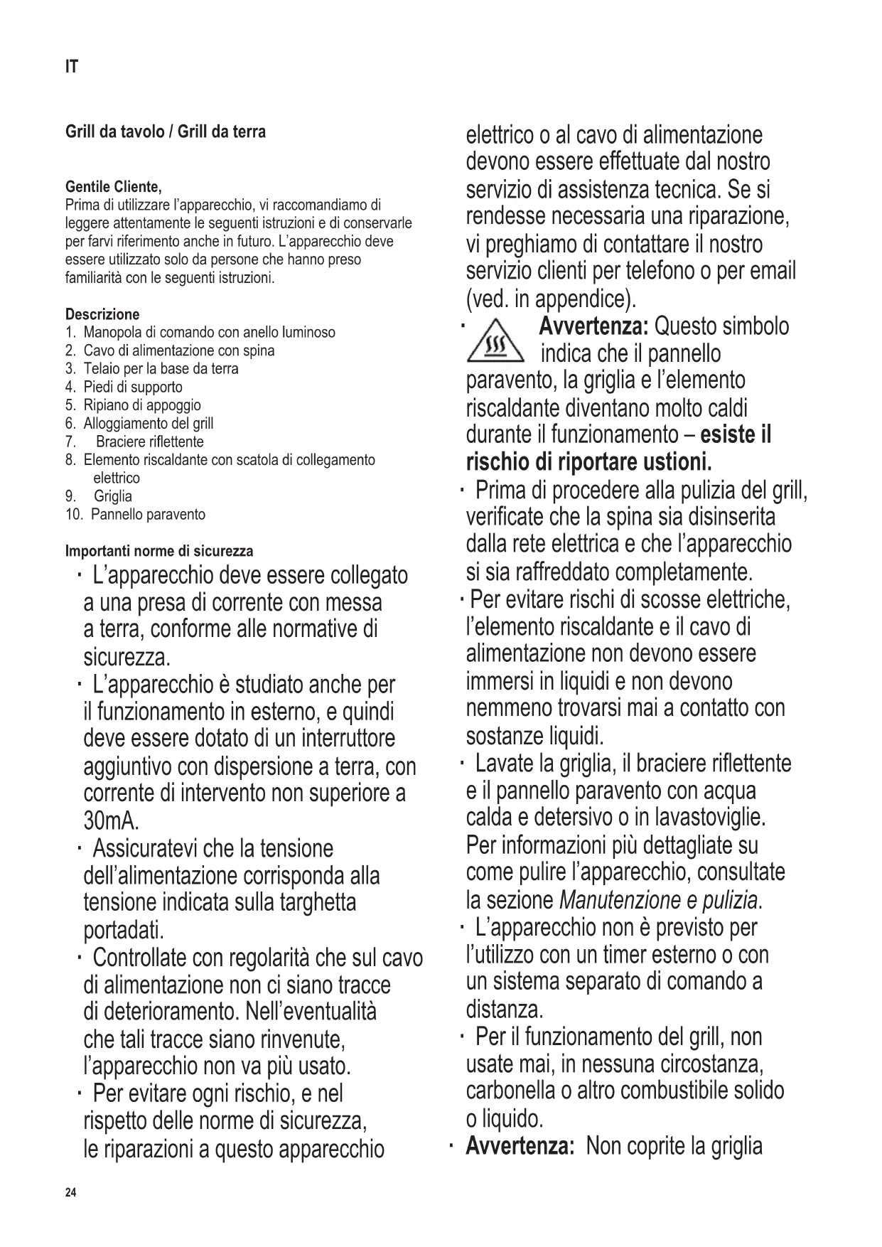 Avvertenza: Questo simbolo indica che il pannello paravento, la griglia e l’elemento riscaldante diventano molto caldi durante il funzionamento – esiste il rischio di riportare ustioni. ∙ Prima di procedere alla pulizia del grill, vericatechelaspinasiadisinserita dalla rete elettrica e che l’apparecchio si sia raffreddato completamente. ∙ Per evitare rischi di scosse elettriche, l’elemento riscaldante e il cavo di alimentazione non devono essere immersi in liquidi e non devono nemmeno trovarsi mai a contatto con sostanze liquidi. ∙ Lavatelagriglia,ilbraciereriettente e il pannello paravento con acqua calda e detersivo o in lavastoviglie. Per informazioni più dettagliate su come pulire l’apparecchio, consultate la sezione Manutenzione e pulizia. ∙ L’apparecchio non è previsto per l’utilizzo con un timer esterno o con un sistema separato di comando a distanza. ∙ Per il funzionamento del grill, non usate mai, in nessuna circostanza, carbonella o altro combustibile solido o liquido. ∙ Avvertenza: Non coprite la griglia IT25 142 x 208 mm con fogli d’alluminio, piatti di portata o altri oggetti, l’accumulo di calore che ne risulterebbe potrebbe danneggiare seriamente il grill. ∙ Nelbraciereriettentedeveessere versata una quantità massima di acqua di 900 ml. ∙ Questo apparecchio è studiato per il solo uso domestico o per impieghi simili, come per esempio - in cucine per il personale, negozi, ufciealtriambientisimilidilavoro, - in aziende agricole, - da clienti di alberghi, motel e sistemazioni simili, - da clienti di pensioni “bed-and- breakfast” (letto & colazione). ∙ Il presente apparecchio può essere usato da bambini (di almeno 8 anni di età) e da persone con ridotte capacitàsiche,sensorialiomentali,o persone senza particolari esperienze o conoscenze, purché siano sotto sorveglianza o siano state date loro istruzioni sull’uso dell’apparecchio e comprendano pienamente i rischi e le precauzioni di sicurezza che l’apparecchio comporta. ∙ Ai bambini non deve essere consentito di giocare con l’apparecchio. ∙ Ai bambini non deve essere consentito di effettuare operazioni di pulizia o di manutenzione sull’apparecchio a meno che non siano supervisionati da un adulto e siano comunque più grandi di 8 anni di età. ∙ L’apparecchio e il cavo di alimentazione devono essere tenuti sempre fuori della portata di bambini di età inferiore agli 8 anni. ∙ Avvertenza: Tutto il materiale di imballaggio deve essere tenuto fuori della portata dei bambini a causa del rischio potenziale esistente, per esempio di soffocamento. ∙ Prima di ogni utilizzo, controllate attentamente che l’apparecchio non presenti tracce di deterioramento. Non usate l’apparecchio nel caso in cui abbia incidentalmente subito colpi: danni anche invisibili ad occhio nudo potrebbero comportare conseguenze negative sulla sicurezza nel funzionamento dell’apparecchio. ∙ Ilgrillvautilizzatoesclusivamentesuunasupercie piana termoresistente, che sia anche impermeabile agli schizzi e alle macchie, dato che non sempre è possibile evitare schizzi durante la cottura di cibi ad alto contenuto di grassi o d’acqua. ∙ Non mettete il grill vicino ad una parete o in un angolo, e assicuratevi che tutt’intorno non ci siano materiali inammabili. ∙ Tenete sempre presente che i cibi ad alto contenuto di grassi o liquidi possono prendere fuoco; per questo, riempite di acqua il braciere riettente prima dell’uso. Collegate il grill alla rete elettrica solo dopo aver riempito il braciere di acqua. L’acqua contribuisce al raffreddamento del braciere, ne facilita la pulizia e riduce la formazione di fumo. Controllate costantemente il livello di acqua. Aggiungete l’acqua a tempo debito, ma fate attenzione a non bagnare l’elemento riscaldante. Avvertenza: Scollegate il grill dall’alimentazione elettrica prima di aggiungere acqua. ∙ Prima di usare il grill, sistemate correttamente l’elemento riscaldante nel braciere riettente e nell’alloggiamento. ∙ Il grill deve restare sotto costante sorveglianza durante l’uso. ∙ Tenete sempre presente che l’elemento riscaldante e la griglia diventano molto caldi durante il funzionamento. Anche dopo aver spento l’elemento riscaldante, non devono essere toccati prima che si siano raffreddati sufcientemente–altrimenti esiste il serio rischio di riportare ustioni. ∙ Evitate che il cavo di alimentazione venga a contatto con parti dell’apparecchio soggette a riscaldarsi. ∙ Disinserite sempre la spina dalla presa di corrente a muro - prima di riempire di acqua il braciere riettente, - dopo l’uso, - in caso di cattivo funzionamento, - prima di pulire l’apparecchio. ∙ L’uso di cavi di prolunga ad avvolgimento causano una perdita di potenza, a cui si può aggiungere un conseguente accumulo di calore all’interno del cavo. È quindi necessario svolgere completamente il cavo26 142 x 208 mm prima dell’uso. Accertatevi che il cavo sia omologato perl’usoinesternieadattoperlapotenzaspecica dell’apparecchio (riportata sulla targhetta portadati). ∙ Avvertenza: Non spostate il grill mentre è già in funzione. Prima di muovere, trasportare, pulire o riporre il grill, assicuratevi che si sia raffreddato sufcientemente.Dopol’uso,eliminateogniresiduodi acqua. ∙ Vi raccomandiamo di non riporre il grill all’esterno, o in locali sottoposti a temperature estreme o ad alti tassi di umidità. ∙ Nessuna responsabilità verrà assunta in caso di danni risultanti da un uso erroneo o dalla non conformità alle istruzioni. ∙ Questo prodotto è conforme alle direttive vincolanti per l’etichettatura CE. Primo utilizzo ∙ Eliminate completamente il materiale e gli adesivi di imballaggio dall’apparecchio. ∙ Lavatelagriglia,ilbraciereriettenteeilpannello paravento con dell’acqua calda e sapone e dopo asciugate tutto accuratamente. ∙ Montate l’apparecchio seguendo quanto descritto in Preparazione dell’apparecchio. 
