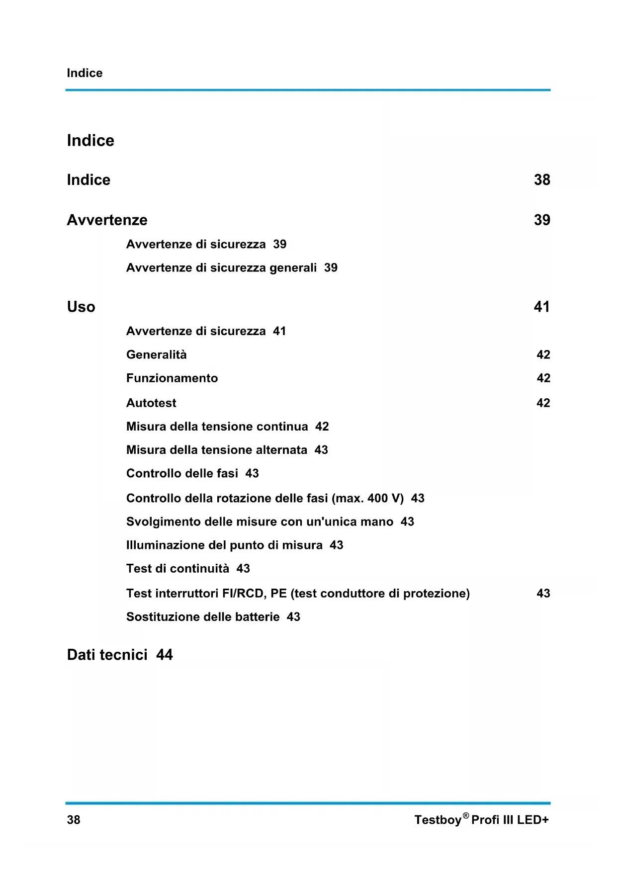 Profi III LED+ Indice Indice 38 Avvertenze 39 Avvertenze di sicurezza 39 Avvertenze di sicurezza generali 39 Uso 41 Avvertenze di sicurezza 41 Generalità 42 Funzionamento 42 Autotest 42 Misura della tensione continua 42 Misura della tensione alternata 43 Controllo delle fasi 43 Controllo della rotazione delle fasi (max. 400 V) 43 Svolgimento delle misure con un'unica mano 43 Illuminazione del punto di misura 43 Test di continuità 43 Test interruttori FI/RCD, PE (test conduttore di protezione) 43 Sostituzione delle batterie 43 Dati tecnici 44Avvertenze Testboy