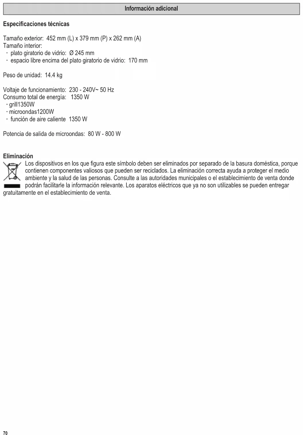 Scongelamento Programma di scongelamento A-1 Patate al forno Mettete le patate crude, non sbucciate, su un piatto adatto e inseritelo al centro del forno. A-2 Bevande Per riscaldare bevande o acqua calda per preparare tè o caffè solubile A-3 Popcorn Per preparare popcorn con la funzione a microonde (disponibili in sacchetti predisposti). Leggete sempre le istruzioni del produttore riportate sul sacchetto. A-4 Riscaldamento Per riscaldare alimenti solidi. A-5 Fettuccine, pasta Mettete la pasta in un contenitore adatto e ricopritela di acqua fredda, sistemate il contenitore sulla piastra girevole. A-6 Pizza Per preparare pizze congelate. Fate sempre pre-riscaldare l’apparecchio seguendo le istruzioni del produttore riportate sulla confezione della pizza e poi scegliete il programma automatico più adatto. Utilizzate la griglia con i piedini bassi. A-7 Pollo arrosto Mettete un pollo intero in un contenitore adatto al centro del forno. Quattro segnali acustici indicano che sono trascorsi i 2/3 del tempo di cottura pre-programmato, a questo punto il processo di cottura è interrotto. Girate il pollo e premete la manopola di controllo per continuare il processo di cottura. A-8 Ciambella Questo programma è indicato per preparare delle ciambelle semplici con ricette base. Vi raccomandiamo di fare riferimento alle istruzioni base della ricetta per i corretti tempi di pre-riscaldamento. Versate l’impasto in una teglia da forno e sistemate la teglia sulla piastra girevole. A-9 Scongelamento Vedete la sezione Programma di scongelamento di questo manuale di istruzioni. Dispositivo di sicurezza per i bambini: Questo dispositivo di sicurezza impedisce che i bambini possano mettere in funzione l’elettrodomestico senza sorveglianza. Per attivare il dispositivo di sicurezza, premete per 3 secondi. Sul display comparirà il simbolo . Per disattivare il dispositivo di sicurezza, premete per altri 3 secondi. Il simbolo scomparirà. N.B.: In caso di eventuali problemi nell’accensione dell’elettrodomestico, vericate prima che il dispositivo di sicurezza non sia attivato. Illuminazione interna: L’illuminazione interna si accende quando viene aperto lo sportello; rimane accesa anche durante il funzionamento. Comunque, se il programma è terminato, la luce si spegne.84 142 x 208 mm Manutenzione e pulizia ∙ Prima di procedere alla pulizia dell’apparecchio, assicuratevi che l’apparecchio sia disinserito dalla presa di corrente e si sia completamente raffreddato. ∙ Non pulite l’apparecchio con acqua. Impedite che dell’acqua (sia pur in minima quantità) penetri nelle fenditure di aerazione collocate sulle pareti interne o esterne dell’apparecchio. È decisamente sconsigliato l’uso di apparecchi di pulizia a vapore per pulire questo forno. ∙ L’intero apparecchio va pulito con un panno non lanuginoso leggermente umido e con un detersivo casalingo delicato. In seguito asciugatelo accuratamente. ∙ Non usate soluzioni abrasive o detergenti concentrati. Non utilizzate prodotti spray per la pulizia dei forni convenzionali disponibili sul mercato. ∙ Le pareti interne devono essere accuratamente pulite dopo ogni ciclo di funzionamento. La parte interna dello sportello, il telaio dello sportello, l’unità motore e la pista guida che si trova sotto la piastra girevole in vetro devono essere mantenuti sempre puliti. ∙ Le griglie, l’anello girevole e l’elemento di trasmissione del movimento possono essere lavati con acqua calda e detersivo. Informazioni aggiuntive Scheda tecnica Dimensioni esterne: 452 mm (L), 379 mm (P), 262 mm (A) Dimensioni interne: ∙ piastra girevole in vetro: Ø 245 mm ∙ spazio libero sopra alla piastra girevole in vetro: 170 mm Peso dell’apparecchio: 14,4 chili Tensione d’esercizio: 230 - 240V~ 50 Hz Consumo totale d’energia: 1350 W ∙ graticola 1350 W ∙ microonde 1200 W ∙ funzione ad aria calda 1350 W Uscita microonde: 80 W - 800 W Smaltimento Gli apparecchi contrassegnati con questo simbolo devono essere smaltiti separatamente dai normali riuti domestici perché contengono materiali di valore che possono essere riciclati. Lo smaltimento adeguato protegge l’ambiente e la salute umana. Le autorità locali o il negoziante di riferimento possono fornire ulteriori informazioni in materia.85 142 x 208 mm Mikrobølgeovn Kære kunde, Læs venligst denne brugsanvisning omhyggeligt inden mikrobølgeovnen tages i brug og gem denne brugsanvisning til senere reference. Ovnen bør kun benyttes af personer der er bekendt med denne vejledning. Apparatets dele