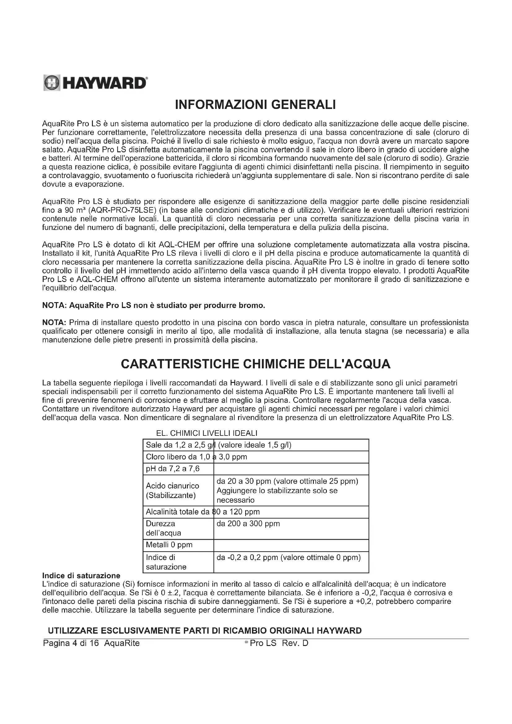 Scarica le istruzioni per il tuo Pompa dell'acqua in formato PDF gratuitamente! Trova il tuo manuale AquaRite Pro LS - HAYWARD e riprendi in mano il tuo dispositivo elettronico. In questa pagina sono pubblicati tutti i documenti necessari per l'utilizzo del tuo dispositivo. AquaRite Pro LS del marchio HAYWARD.