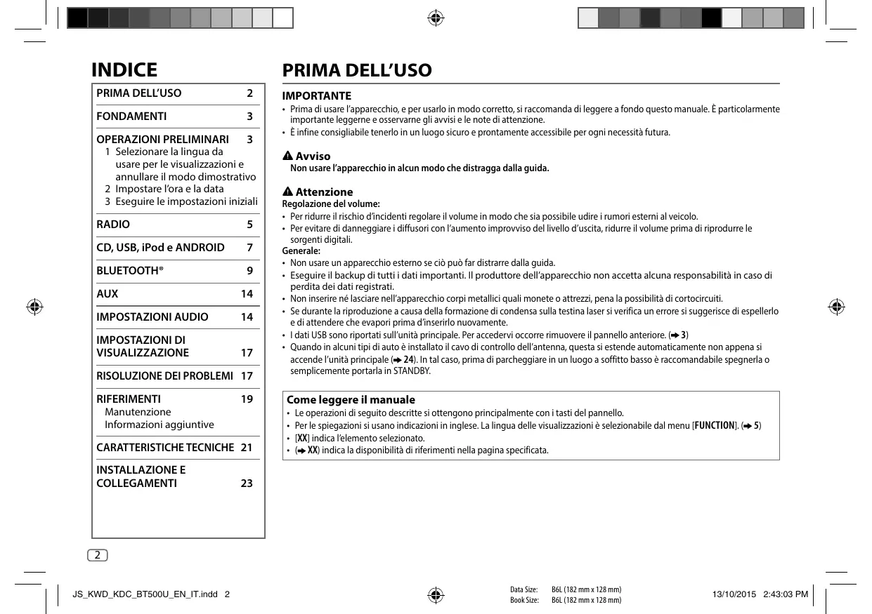 - A seconda della lingua di visualizzazione selezionata ( 5) alcuni caratteri potrebbero non apparire correttamente. ITALIANO JS_KWD_KDC_BT500U_EN_IT.indd 17 Data Size: Book Size: B6L (182 mm x 128 mm) B6L (182 mm x 128 mm)