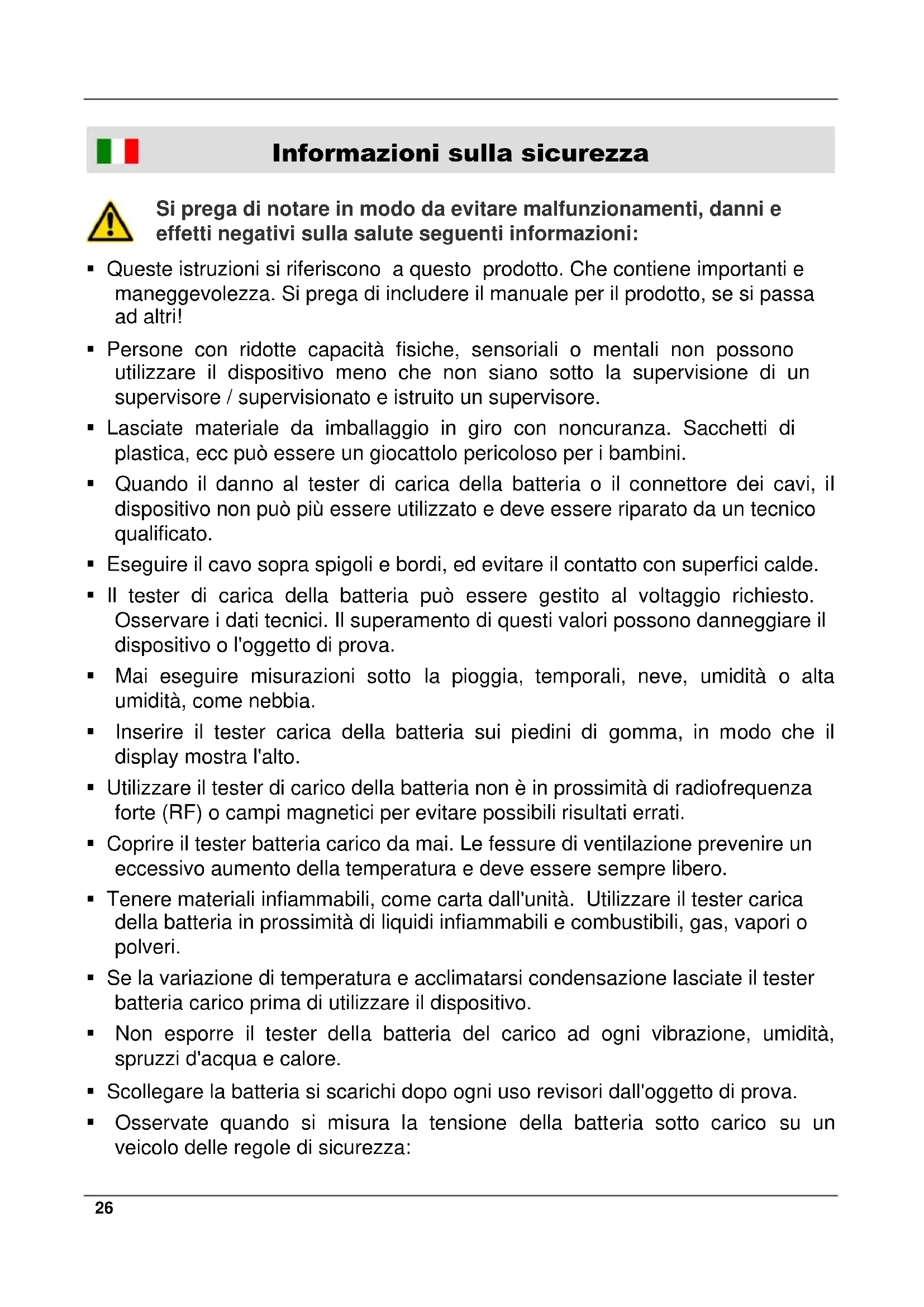 Si prega di notare in modo da evitare malfunzionamenti, danni e effetti negativi sulla salute seguenti informazioni:27 Informazioni sulla sicurezza a) Mantenere sempre un diossido di carbonio fuoco pronto. b) Si consideri la fornitura di protezione antincendio e tenere sostanze infiammabili e materiali in una stanza separata. c) Inserire nel lavorare nella sala macchine, occhiali e guanti protettivi per proteggere, come l'acido della batteria, a benzina, o parti di volo. d) Non toccare quando il motore non ha parti in movimento. e) Immettere legano stretti abiti, capelli lunghi e rimuovere i gioielli sul collo e sulle mani. f) Fornire un sacco di ventilazione come gas di scarico sono altamente tossici. g) Evitare il contatto con parti calde come scarico o sistema di raffreddamento. È possibile ottenere bruciato! h) Verificare che il freno a mano è tirato e la leva al minimo o "P" sta. Assicurarsi che il tester carica della batteria è adatto per i test di ogni oggetto di prova! In caso di dubbio, chiedere ad un esperto. Se il tester carica della batteria è visibilmente danneggiato, non funziona correttamente o è stato conservato in condizioni avverse e ad accettare, è che la sicurezza operativa non è più possibile, non è più utilizzare il dispositivo. Utilizzare solo le misure corrette per la fiera collegata tubi e fare in modo prima dell'uso che l'isolamento sia intatto. Attenzione! L'uso di batterie piombo-acido è pericoloso! Si prega di notare le istruzioni aggiuntive per batterie piombo-acido. Non smontare il tester di carica della batteria, e di non tentare alcuna riparazione. Il dispositivo non contiene parti sostituibili dall'utente o da riparare. Se avete problemi contattate il nostro servizio clienti.28 Informazioni supplementari per batterie al piombo Quando si tratta di batterie al piombo può venire alla nascita di gas altamente esplosiva. Questo può essere l'ossigeno-idrogeno da una scintilla da una sigaretta o una fiamma sarà accesa e scoppiò la (accumulatore) risultato della batteria. Questo è il spruzzato nella compilato acido della batteria e può causare gravi ustioni! Inserisci Pertanto, quando si tratta di batterie al piombo, occhiali di sicurezza ed evitare di toccare la batteria con la pelle e gli indumenti. Indossare guanti protettivi! Non fumare nelle immediate vicinanze di una batterie piombo-acido. Evitare fiamme libere. Garantire una ventilazione adeguata! Scarica batterie piombo-acido congelare a temperature estremamente basse. Mai controllare un gelato batteria al piombo! Non collocare il tester batteria carico sul test da batteria al piombo! Inserisci la batteria al piombo per più di 10 secondi. In caso di contatto con gli occhi con l'acido della batteria, subito gli occhi per almeno 5 minuti, risciacquare con acqua pulita e consultare immediatamente un medico! In nessun caso farmaci o collirio da utilizzare senza consultare un medico. L'efficienza di una batteria al piombo diminuisce al diminuire della temperatura. Una batteria completamente carica a -18 ° C, per esempio, solo il 40%. La maggior parte delle batterie può essere danneggiato da sovraccarico. Tutte le batterie sono soggette ad un normale autoscarica, che aumenta con l'aumentare della temperatura. L'auto-scarica delle batterie esenti da manutenzione è inferiore al tasso di normali batterie piombo-acido. Le batterie devono essere conservati al fresco per mantenere la bassa autoscarica. Attenzione! La batteria non deve essere congelato! Una batteria completamente carica si blocca a circa -65 °C, a carico di un 50% di batteria carica a -26 °C a 25% e una fotocamera a -15 °C. Una batteria memorizzati in uno stato dimesso "sulfated" e perde la sua capacità. Solfatazione a formare attraverso i depositi di zolfo sulle piastre. Una batteria completamente carica ha un guasto senza tensione a circuito aperto di 12,7 V e altro ancora. Una batteria difettosa o scarica ha una tensione a circuito aperto di 10,5 V e di meno.V Wir, die Westfalia Werkzeugcompany, Werkzeugstraße 1, D-58093 Hagen, We, the Westfalia Werkzeugcompany, Werkzeugstraße 1, D-58093 Hagen, erklären in alleiniger Verantwortung, dass das Produkt declare by our own responsibility that the product 100 Ampere Batteriebelastungsprüfer 100 Ampere Battery Load Tester Artikel Nr. 15 30 15 Article No. 15 30 15 den wesentlichen Schutzanforderungen genügt, die in den Europäischen Richtlinien und deren Änderungen festgelegt sind. is according to the basic requirements, which are defined in the European Directives and their amendments. 2011/65/EU 2011/65/EU Beschränkung der Verwendung bestimmter gefährlicher Stoffe in Elektro- und Elektronikgeräten (RoHS) Restriction of the Use of certain hazardous Substances in electrical and electronic Equipment (RoHS) 2014/30/EU 2014/30/EU Elektromagnetische Verträglichkeit (EMV) Electromagnetic Compatibility (EMC) EN 55011:2016+A1+A11, EN 61326-1:2013