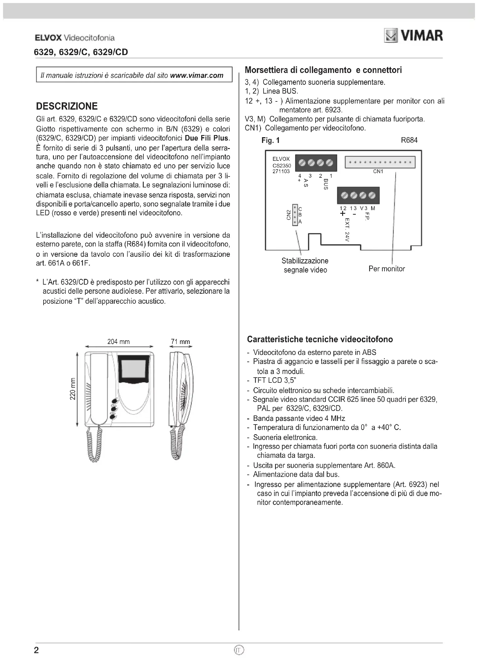 Giotto 6329, 6329/C, 6329/CD* Videocitofono Giotto b/n Due Fili / Videocitofono Giotto colori Due Fili B/W Giotto Due Fili monitor / Colour Giotto Due Fili monitor Portier-vidéo Giotto b/n Due Fili / Portier-vidéo Giotto couleurs Due Fili S/W-Videohaustelefon Giotto DueFili / Farb-Videohaustelefon Giotto DueFili Videoportero Giotto b/n Due Fili / Videoportero Giotto colores Due Fili Video porteiro Giotto b/p Due Fili / Video porteiro Giotto cores b/p Due Fili Manuale installatore - Installer guide Manuel installateur - Technisches Handbuch Instrucciones instalador - Manual do instaladorFig. 1 Caratteristiche tecniche videocitofono - Videocitofono da esterno parete in ABS - Piastra di aggancio e tasselli per il fissaggio a parete o sca- tola a 3 moduli. - TFT LCD 3,5” - Circuito elettronico su schede intercambiabili. - Segnale video standard CCIR 625 linee 50 quadri per 6329, PAL per 6329/C, 6329/CD. - Banda passante video 4 MHz - Temperatura di funzionamento da 0° a +40° C. - Suoneria elettronica. - Ingresso per chiamata fuori porta con suoneria distinta dalla chiamata da targa. - Uscita per suoneria supplementare Art. 860A. - Alimentazione data dal bus. - Ingresso per alimentazione supplementare (Art. 6923) nel caso in cui l’impianto preveda l’accensione di più di due mo- nitor contemporaneamente. DESCRIZIONE Gli art. 6329, 6329/C e 6329/CD sono videocitofoni della serie Giotto rispettivamente con schermo in B/N (6329) e colori (6329/C, 6329/CD) per impianti videocitofonici Due Fili Plus. È fornito di serie di 3 pulsanti, uno per l’apertura della serra- tura, uno per l’autoaccensione del videocitofono nell’impianto anche quando non è stato chiamato ed uno per servizio luce scale. Fornito di regolazione del volume di chiamata per 3 li- velli e l’esclusione della chiamata. Le segnalazioni luminose di: chiamata esclusa, chiamate inevase senza risposta, servizi non disponibili e porta/cancello aperto, sono segnalate tramite i due LED (rosso e verde) presenti nel videocitofono. L’installazione del videocitofono può avvenire in versione da esterno parete, con la staffa (R684) fornita con il videocitofono, o in versione da tavolo con l’ausilio dei kit di trasformazione art. 661A o 661F.