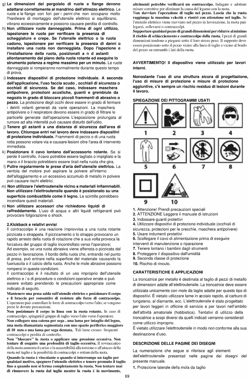 a) Posizionare te stesso e gli astanti lontano dal piano della ruota rotante. La protezione aiuta a proteggere l'operatore dai frammenti delle ruote rotti e dal contatto accidentale con la ruota. b) Utilizzare solo mole da taglio rinforzate legate per il proprio elettroutensile. Solo perché un accessorio può essere attaccato al tuo elettroutensile, non garantisce un funzionamento sicuro. c) La velocità nominale dell'accessorio deve essere almeno pari alla velocità massima indicata sull'utensile elettrico. Gli accessori che funzionano più velocemente della loro velocità nominale possono rompersi e volare a pezzi. d) Le ruote devono essere utilizzate solo per le applicazioni consigliate. Ad esempio: non macinare con il lato di una mola da taglio. Le mole abrasive da taglio sono destinate alla rettifica periferica, le forze laterali applicate a queste ruote possono farle frantumare. e) Utilizzare sempre flange non danneggiate del diametro corretto per la ruota selezionata. Flange ruota adeguate supportano la ruota riducendo così la possibilità di rottura della ruota. f) Il diametro esterno e lo spessore dell'accessorio devono rientrare nella capacità nominale dell'utensile elettrico . Gli accessori di dimensioni errate non possono essere adeguatamente protetti o controllati.69 g) Le dimensioni del pergolato di ruote e flange devono adattarsi correttamente al mandrino dell'attrezzo elettrico. Le ruote e le flange con fori per i perni che non occupano molto l'hardware di montaggio dell'utensile elettrico si squilibrano, vibrano eccessivamente e possono causare perdita di controllo. h) Non utilizzare ruote danneggiate. Prima di ogni utilizzo, ispezionare le ruote per verificare la presenza di scheggiature e crepe. Se l'utensile elettrico o la ruota cadono, ispezionare per verificare la presenza di danni o installare una ruota non danneggiata. Dopo l'ispezione e l'installazione della ruota, posizionati a n d astanti allontanamento dal piano della ruota rotante ed eseguire lo strumento potenza a regime massimo per un minuto. Le ruote danneggiate si romperanno normalmente durante questo tempo di prova.