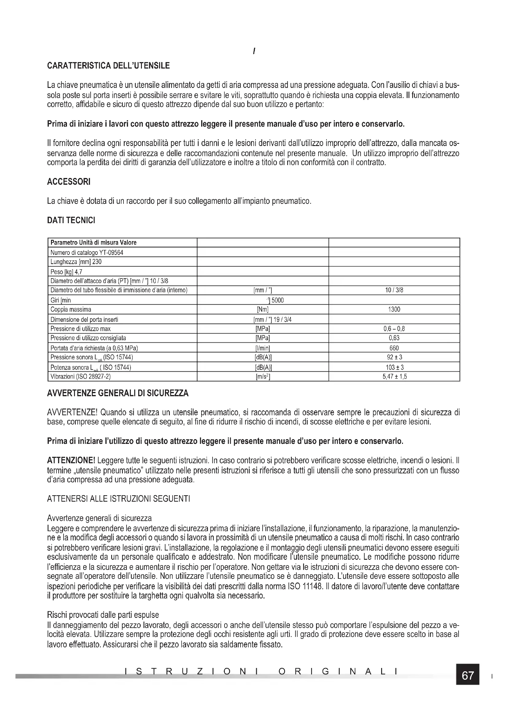 La chiave pneumatica è un utensile alimentato da getti di aria compressa ad una pressione adeguata. Con l’ausilio di chiavi a bus- sola poste sul porta inserti è possibile serrare e svitare le viti, soprattutto quando è richiesta una coppia elevata. Il funzionamento corretto, affi dabile e sicuro di questo attrezzo dipende dal suo buon utilizzo e pertanto: Prima di iniziare i lavori con questo attrezzo leggere il presente manuale d’uso per intero e conservarlo. Il fornitore declina ogni responsabilità per tutti i danni e le lesioni derivanti dall’utilizzo improprio dell’attrezzo, dalla mancata os- servanza delle norme di sicurezza e delle raccomandazioni contenute nel presente manuale. Un utilizzo improprio dell’attrezzo comporta la perdita dei diritti di garanzia dell’utilizzatore e inoltre a titolo di non conformità con il contratto. ACCESSORI La chiave è dotata di un raccordo per il suo collegamento all’impianto pneumatico. DATI TECNICI Parametro Unità di misura Valore Numero di catalogo YT-09564 Lunghezza [mm] 230 Peso [kg] 4,7 Diametro dell’attacco d’aria (PT) [mm / ”] 10 / 3/8 Diametro del tubo fl essibile di immissione d’aria (interno) [mm / ”] 10 / 3/8 Giri [min