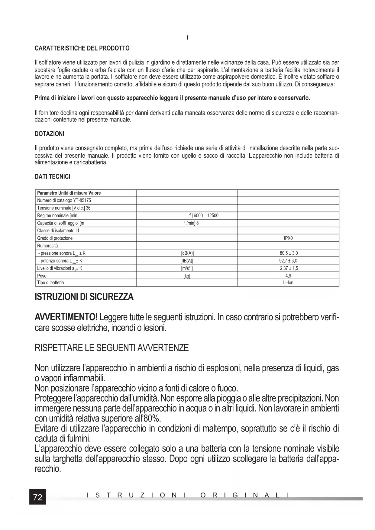 Il soffi atore viene utilizzato per lavori di pulizia in giardino e direttamente nelle vicinanze della casa. Può essere utilizzato sia per spostare foglie cadute o erba falciata con un fl usso d’aria che per aspirarle. L’alimentazione a batteria facilita notevolmente il lavoro e ne aumenta la portata. Il soffi atore non deve essere utilizzato come aspirapolvere domestico. È inoltre vietato soffi are o aspirare ceneri. Il funzionamento corretto, affi dabile e sicuro di questo prodotto dipende dal suo buon utilizzo. Di conseguenza: Prima di iniziare i lavori con questo apparecchio leggere il presente manuale d’uso per intero e conservarlo. Il fornitore declina ogni responsabilità per danni derivanti dalla mancata osservanza delle norme di sicurezza e delle raccoman- dazioni contenute nel presente manuale. DOTAZIONI Il prodotto viene consegnato completo, ma prima dell’uso richiede una serie di attività di installazione descritte nella parte suc- cessiva del presente manuale. Il prodotto viene fornito con ugello e sacco di raccolta. L’apparecchio non include batteria di alimentazione e caricabatteria. DATI TECNICI Parametro Unità di misura Valore Numero di catalogo YT-85175 Tensione nominale [V d.c.] 36 Regime nominale [min