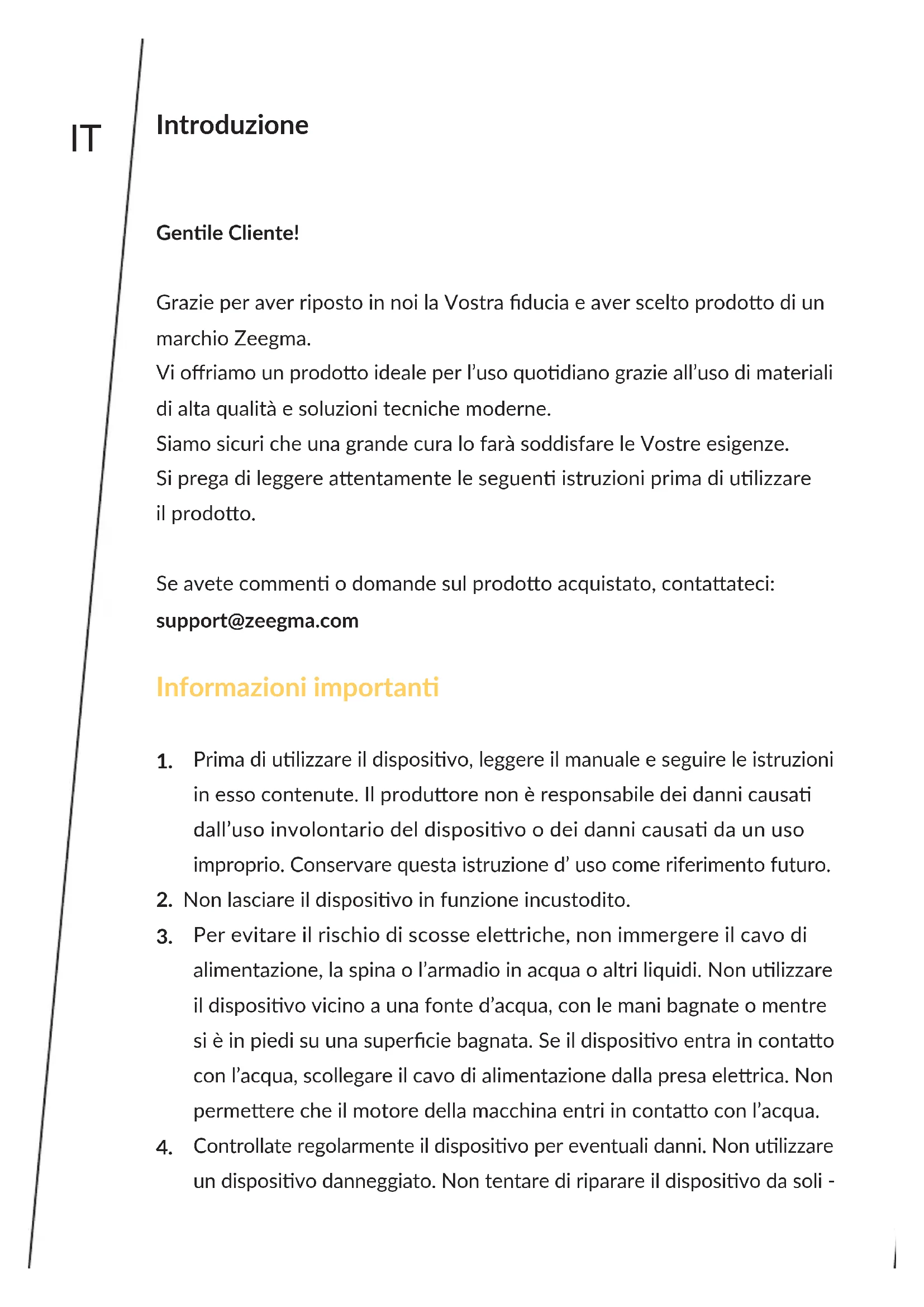Zdjęcia mają charakter poglądowy, rzeczywisty wygląd produktów może różnić się od prezentowanego na zdjęciach.IT Introduzione Genle Cliente! Grazie per aver riposto in noi la Vostra ducia e aver scelto prodoo di un marchio Zeegma. Vi oriamo un prodoo ideale per l’uso quodiano grazie all’uso di materiali di alta qualità e soluzioni tecniche moderne. Siamo sicuri che una grande cura lo farà soddisfare le Vostre esigenze. Si prega di leggere aentamente le seguen istruzioni prima di ulizzare il prodoo. Se avete commen o domande sul prodoo acquistato, contaateci: support@zeegma.com Informazioni importan