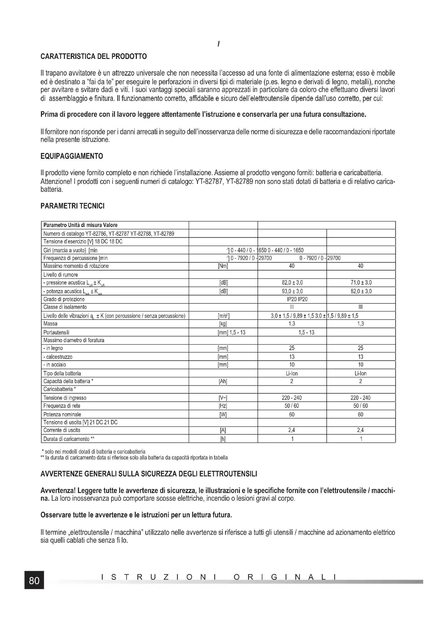 Il trapano avvitatore è un attrezzo universale che non necessita l’accesso ad una fonte di alimentazione esterna; esso è mobile ed è destinato a “fai da te” per eseguire le perforazioni in diversi tipi di materiale (p.es. legno e derivati di legno, metalli), nonche per avvitare e svitare dadi e viti. I suoi vantaggi speciali saranno apprezzati in particolare da coloro che eff ettuano diversi lavori di assemblaggio e fi nitura. Il funzionamento corretto, affi dabile e sicuro dell’elettroutensile dipende dall’uso corretto, per cui: Prima di procedere con il lavoro leggere attentamente l’istruzione e conservarla per una futura consultazione. Il fornitore non risponde per i danni arrecati in seguito dell’inosservanza delle norme di sicurezza e delle raccomandazioni riportate nella presente istruzione. EQUIPAGGIAMENTO Il prodotto viene fornito completo e non richiede l’installazione. Assieme al prodotto vengono forniti: batteria e caricabatteria. Attenzione! I prodotti con i seguenti numeri di catalogo: YT-82787, YT-82789 non sono stati dotati di batteria e di relativo carica- batteria. PARAMETRI TECNICI Parametro Unità di misura Valore Numero di catalogo YT-82786, YT-82787 YT-82788, YT-82789 Tensione d’esercizio [V] 18 DC 18 DC Giri (marcia a vuoto) [min