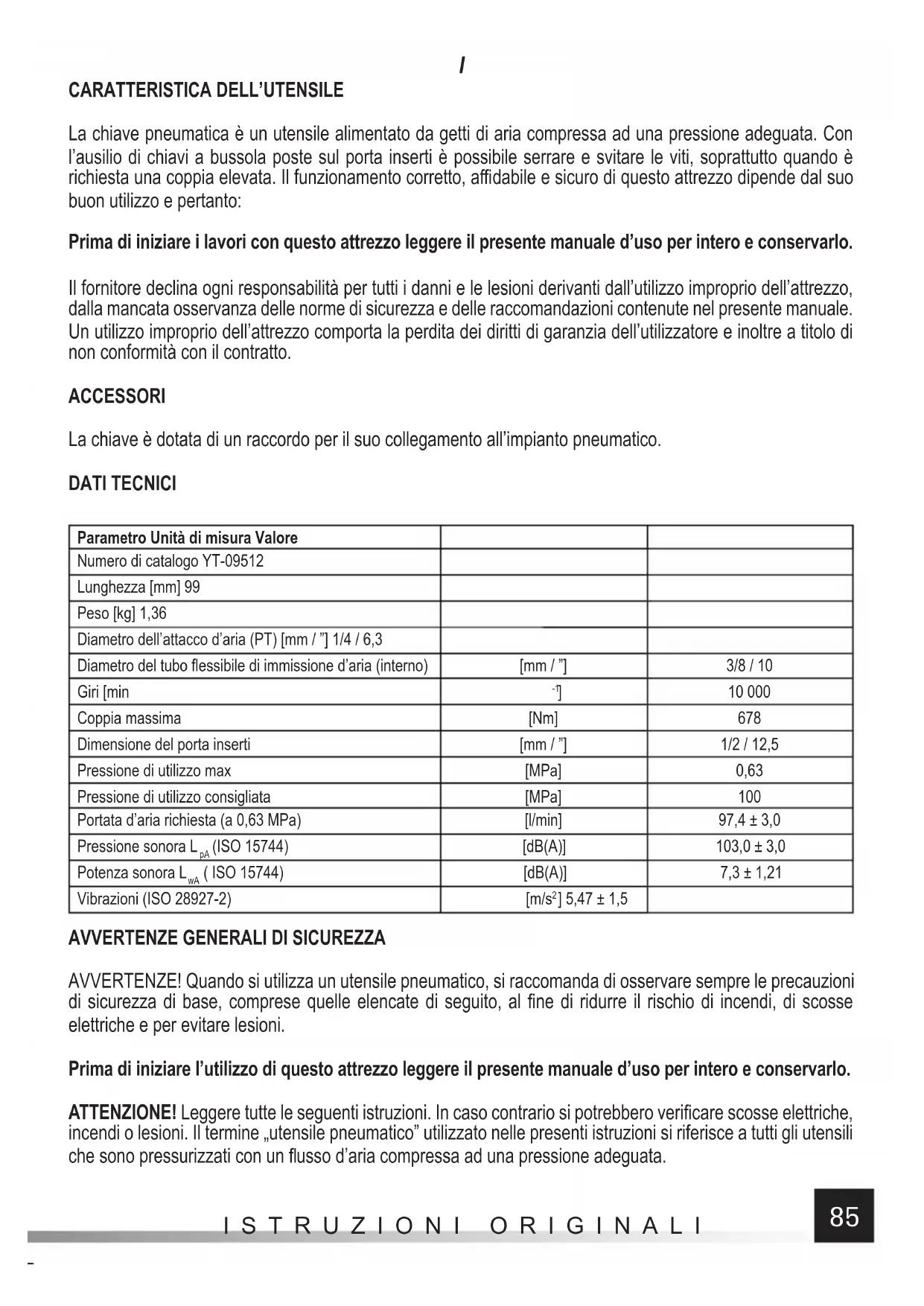 La chiave pneumatica è un utensile alimentato da getti di aria compressa ad una pressione adeguata. Con l’ausilio di chiavi a bussola poste sul porta inserti è possibile serrare e svitare le viti, soprattutto quando è richiesta una coppia elevata. Il funzionamento corretto, affi dabile e sicuro di questo attrezzo dipende dal suo buon utilizzo e pertanto: Prima di iniziare i lavori con questo attrezzo leggere il presente manuale d’uso per intero e conservarlo. Il fornitore declina ogni responsabilità per tutti i danni e le lesioni derivanti dall’utilizzo improprio dell’attrezzo, dalla mancata osservanza delle norme di sicurezza e delle raccomandazioni contenute nel presente manuale. Un utilizzo improprio dell’attrezzo comporta la perdita dei diritti di garanzia dell’utilizzatore e inoltre a titolo di non conformità con il contratto. ACCESSORI La chiave è dotata di un raccordo per il suo collegamento all’impianto pneumatico. DATI TECNICI Parametro Unità di misura Valore Numero di catalogo YT-09512 Lunghezza [mm] 99 Peso [kg] 1,36 Diametro dell’attacco d’aria (PT) [mm / ”] 1/4 / 6,3 Diametro del tubo fl essibile di immissione d’aria (interno) [mm / ”] 3/8 / 10 Giri [min