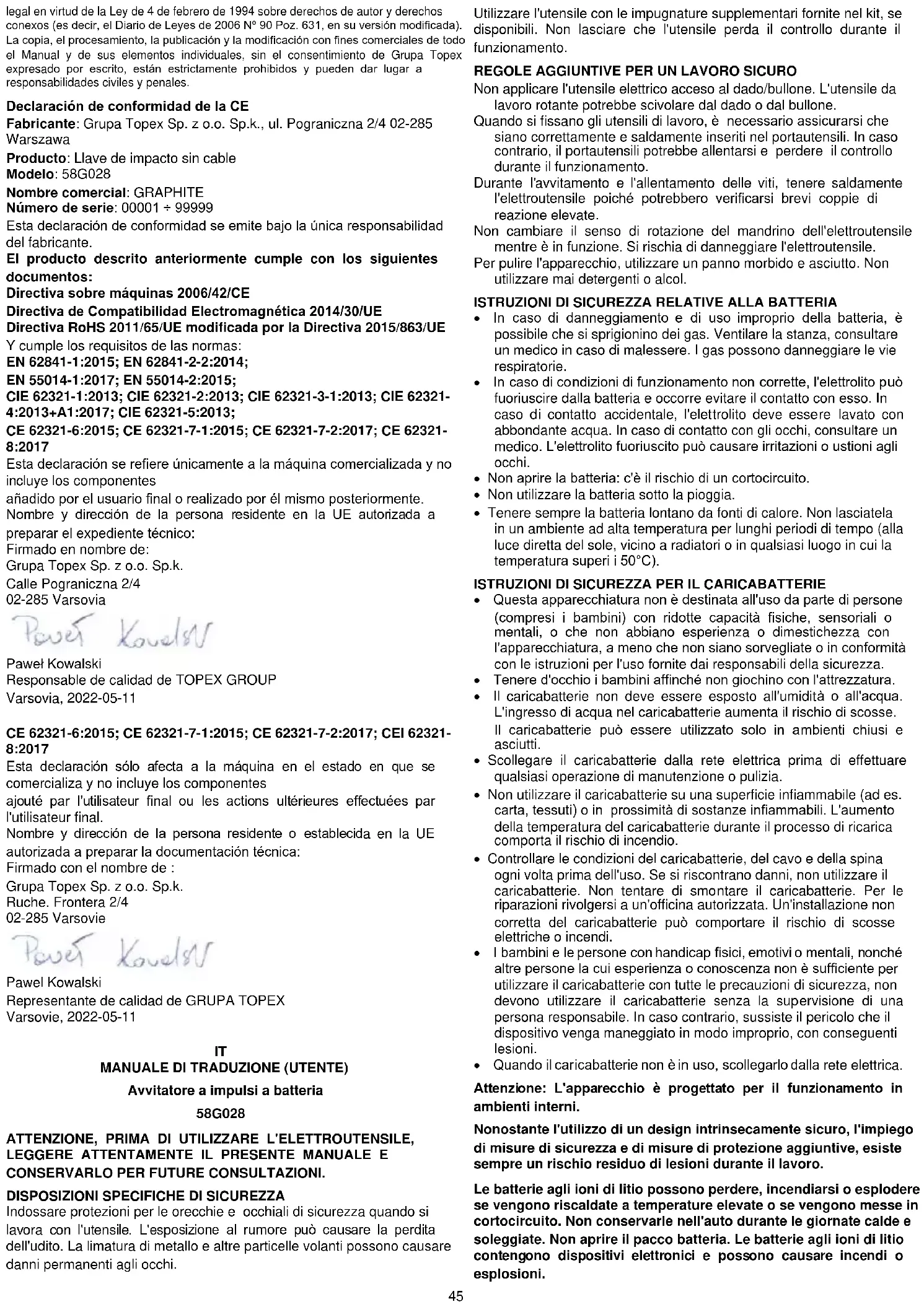 "Grupa Topex Spółka z ograniczoną odpowiedzialnością". Spółka komandytowa con sede legale a Varsavia, ul. Pograniczna 2/4 (di seguito: "Grupa Topex") informa che tutti i diritti d'autore sul contenuto del presente manuale (di seguito: "Manuale"), compresi, tra gli altri. Il testo, le fotografie, i diagrammi, i disegni e la sua composizione appartengono esclusivamente a Grupa Topex e sono tutelati dalla legge del 4 febbraio 1994 sul diritto d'autore e sui diritti connessi (Gazzetta Ufficiale 2006 n. 90 Poz. 631 e successive modifiche). La copia, l'elaborazione, la pubblicazione, la modifica a fini commerciali dell'intero Manuale e dei suoi singoli elementi, senza il consenso di Grupa Topex espresso per iscritto, è severamente vietata e può comportare responsabilità civili e penali. Dichiarazione di conformità CE Produttore: Grupa Topex Sp. z o.o. Sp.k., ul. Pograniczna 2/4 02-285 Warszawa Prodotto: Avvitatore a impulsi a batteria Modello: 58G028 Nome commerciale: GRAFITE Numero di serie: 00001 ÷ 99999 La presente dichiarazione di conformità è rilasciata sotto l'esclusiva responsabilità del produttore. Il prodotto sopra descritto è conforme ai seguenti documenti: Direttiva macchine 2006/42/CE Direttiva sulla compatibilità elettromagnetica 2014/30/UE Direttiva RoHS 2011/65/UE, modificata dalla direttiva 2015/863/UE. E soddisfa i requisiti degli standard: EN 62841-1:2015; EN 62841-2-2:2014; EN 55014-1:2017; EN 55014-2:2015; IEC 62321-1:2013; IEC 62321-2:2013; IEC 62321-3-1:2013; IEC 62321- 4:2013+A1:2017; IEC 62321-5:2013; IEC 62321-6:2015; IEC 62321-7-1:2015; IEC 62321-7-2:2017; IEC 62321-8:2017 La presente dichiarazione si riferisce esclusivamente alla macchina così come immessa sul mercato e non comprende i componenti aggiunte dall'utente finale o eseguite da lui successivamente. Nome e indirizzo della persona residente nell'UE autorizzata a preparare il fascicolo tecnico: Firmato a nome di: Grupa Topex Sp. z o.o. Sp.k. 2/4 Via Pograniczna 02-285 Varsavia Paweł Kowalski Responsabile della qualità del gruppo TOPEX Varsavia, 2022-05-11 IEC 62321-6:2015; IEC 62321-7-1:2015; IEC 62321-7-2:2017; CEI 62321-8:2017 La presente dichiarazione non riguarda che la macchina nello stato in cui è stata immessa sul mercato e non riguarda solo i componenti. ajouté par l'utilisateur final ou les actions ultérieures effectuées par l'utilisateur final. Nome e indirizzo della persona residente o stabilita nell'UE autorizzata a preparare la documentazione tecnica: Firmato con il nome di : Grupa Topex Sp. z o.o. Sp.k. Ruche. Terra di confine 2/4 02-285 Varsovie Pawel Kowalski Rappresentante di qualità di GRUPA TOPEX Varsovie, 2022-05-11