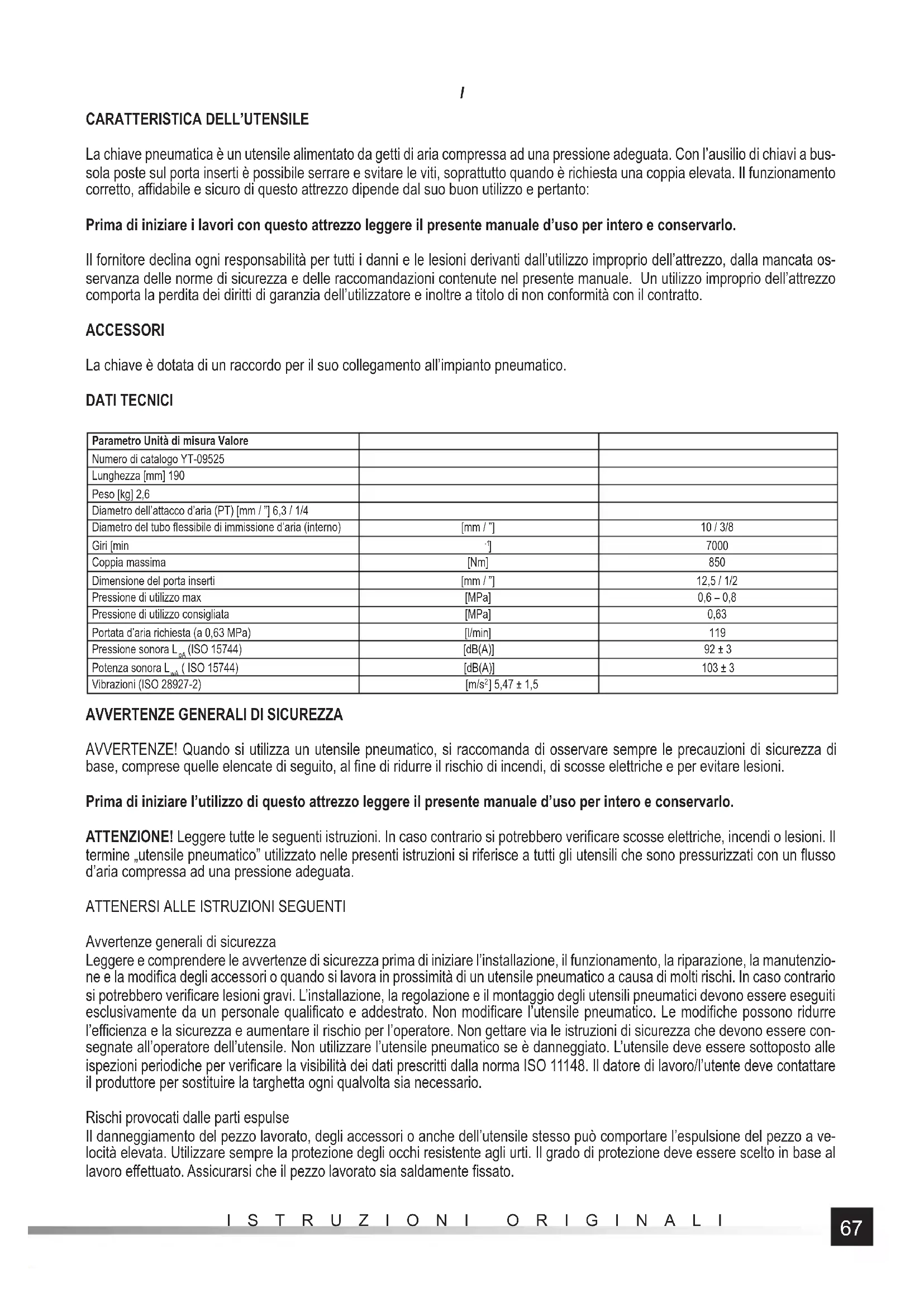 La chiave pneumatica è un utensile alimentato da getti di aria compressa ad una pressione adeguata. Con l’ausilio di chiavi a bus- sola poste sul porta inserti è possibile serrare e svitare le viti, soprattutto quando è richiesta una coppia elevata. Il funzionamento corretto, affi dabile e sicuro di questo attrezzo dipende dal suo buon utilizzo e pertanto: Prima di iniziare i lavori con questo attrezzo leggere il presente manuale d’uso per intero e conservarlo. Il fornitore declina ogni responsabilità per tutti i danni e le lesioni derivanti dall’utilizzo improprio dell’attrezzo, dalla mancata os- servanza delle norme di sicurezza e delle raccomandazioni contenute nel presente manuale. Un utilizzo improprio dell’attrezzo comporta la perdita dei diritti di garanzia dell’utilizzatore e inoltre a titolo di non conformità con il contratto. ACCESSORI La chiave è dotata di un raccordo per il suo collegamento all’impianto pneumatico. DATI TECNICI Parametro Unità di misura Valore Numero di catalogo YT-09525 Lunghezza [mm] 190 Peso [kg] 2,6 Diametro dell’attacco d’aria (PT) [mm / ”] 6,3 / 1/4 Diametro del tubo fl essibile di immissione d’aria (interno) [mm / ”] 10 / 3/8 Giri [min