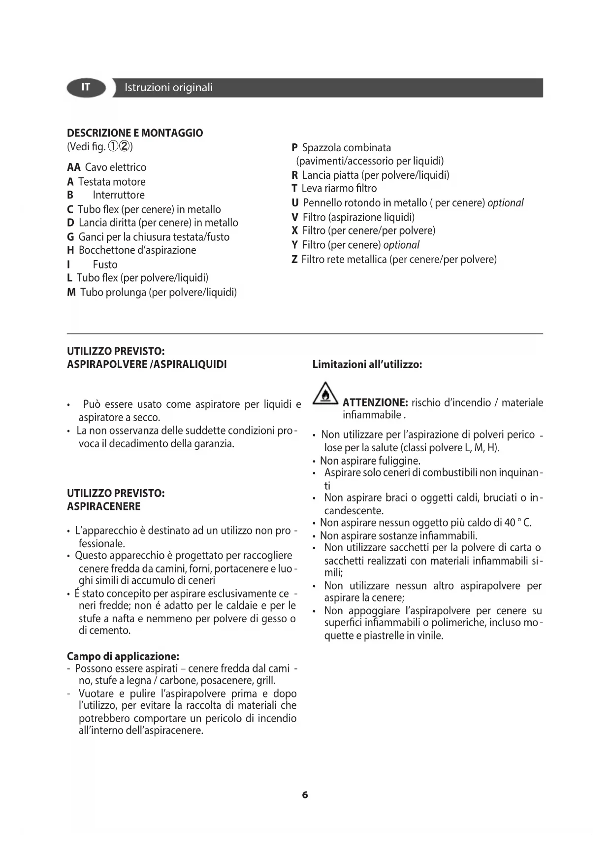 - DESCRIZIONE E MONTAGGIO (Vedi g. ①②) AA Cavo elettrico A Testata motore B Interruttore C Tubo ex (per cenere) in metallo D Lancia diritta (per cenere) in metallo G Ganci per la chiusura testata/fusto H Bocchettone d’aspirazione I Fusto L Tubo ex (per polvere/liquidi) M Tubo prolunga (per polvere/liquidi) P Spazzola combinata (pavimenti/accessorio per liquidi) R Lancia piatta (per polvere/liquidi) T Leva riarmo ltro U Pennello rotondo in metallo ( per cenere) optional V Filtro (aspirazione liquidi) X Filtro (per cenere/per polvere) Y Filtro (per cenere) optional Z Filtro rete metallica (per cenere/per polvere) UTILIZZO PREVISTO: ASPIRAPOLVERE /ASPIRALIQUIDI