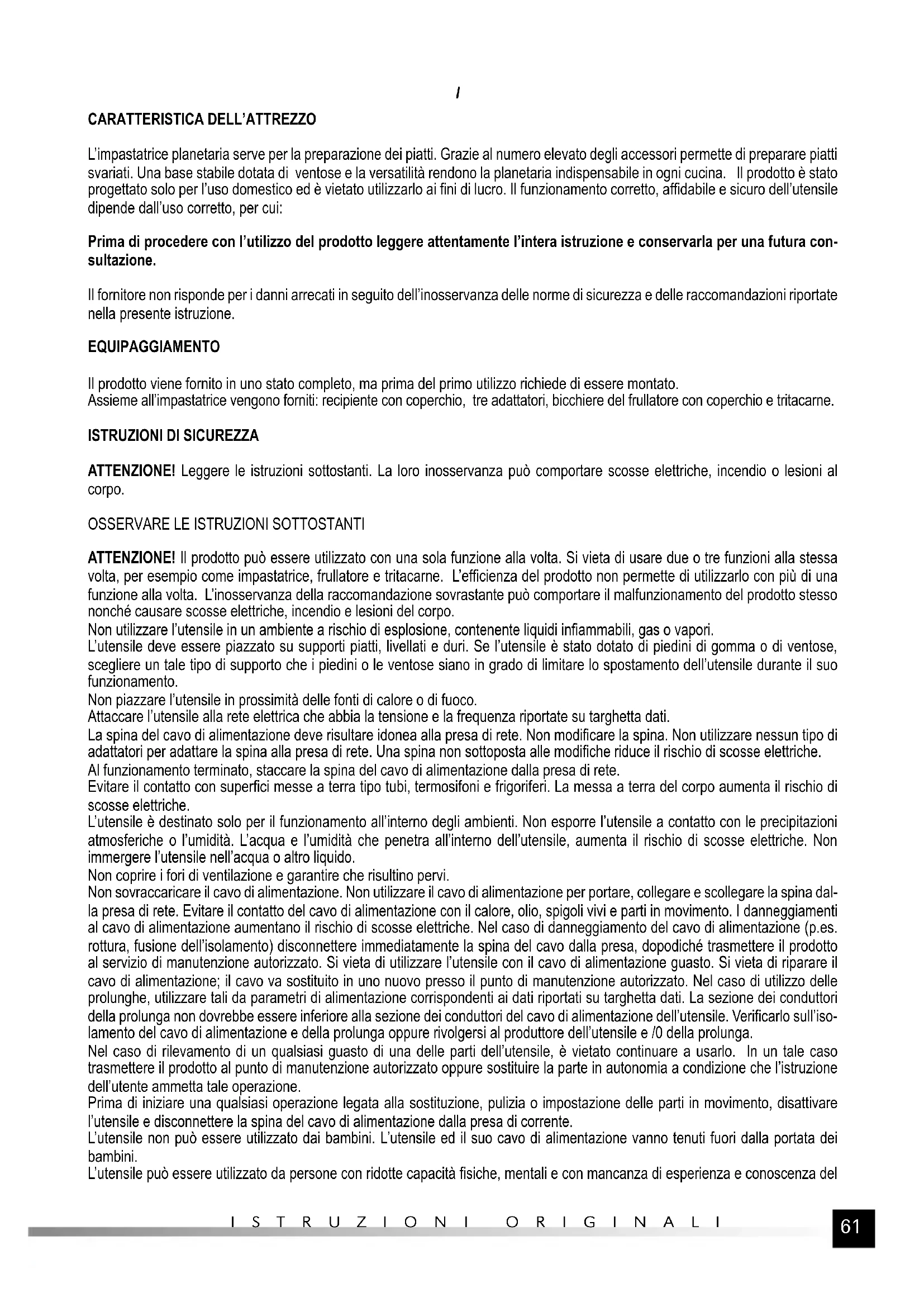 L’impastatrice planetaria serve per la preparazione dei piatti. Grazie al numero elevato degli accessori permette di preparare piatti svariati. Una base stabile dotata di ventose e la versatilità rendono la planetaria indispensabile in ogni cucina. Il prodotto è stato progettato solo per l’uso domestico ed è vietato utilizzarlo ai fini di lucro. Il funzionamento corretto, affidabile e sicuro dell’utensile dipende dall’uso corretto, per cui: Prima di procedere con l’utilizzo del prodotto leggere attentamente l’intera istruzione e conservarla per una futura con- sultazione. Il fornitore non risponde per i danni arrecati in seguito dell’inosservanza delle norme di sicurezza e delle raccomandazioni riportate nella presente istruzione. EQUIPAGGIAMENTO Il prodotto viene fornito in uno stato completo, ma prima del primo utilizzo richiede di essere montato. Assieme all’impastatrice vengono forniti: recipiente con coperchio, tre adattatori, bicchiere del frullatore con coperchio e tritacarne.