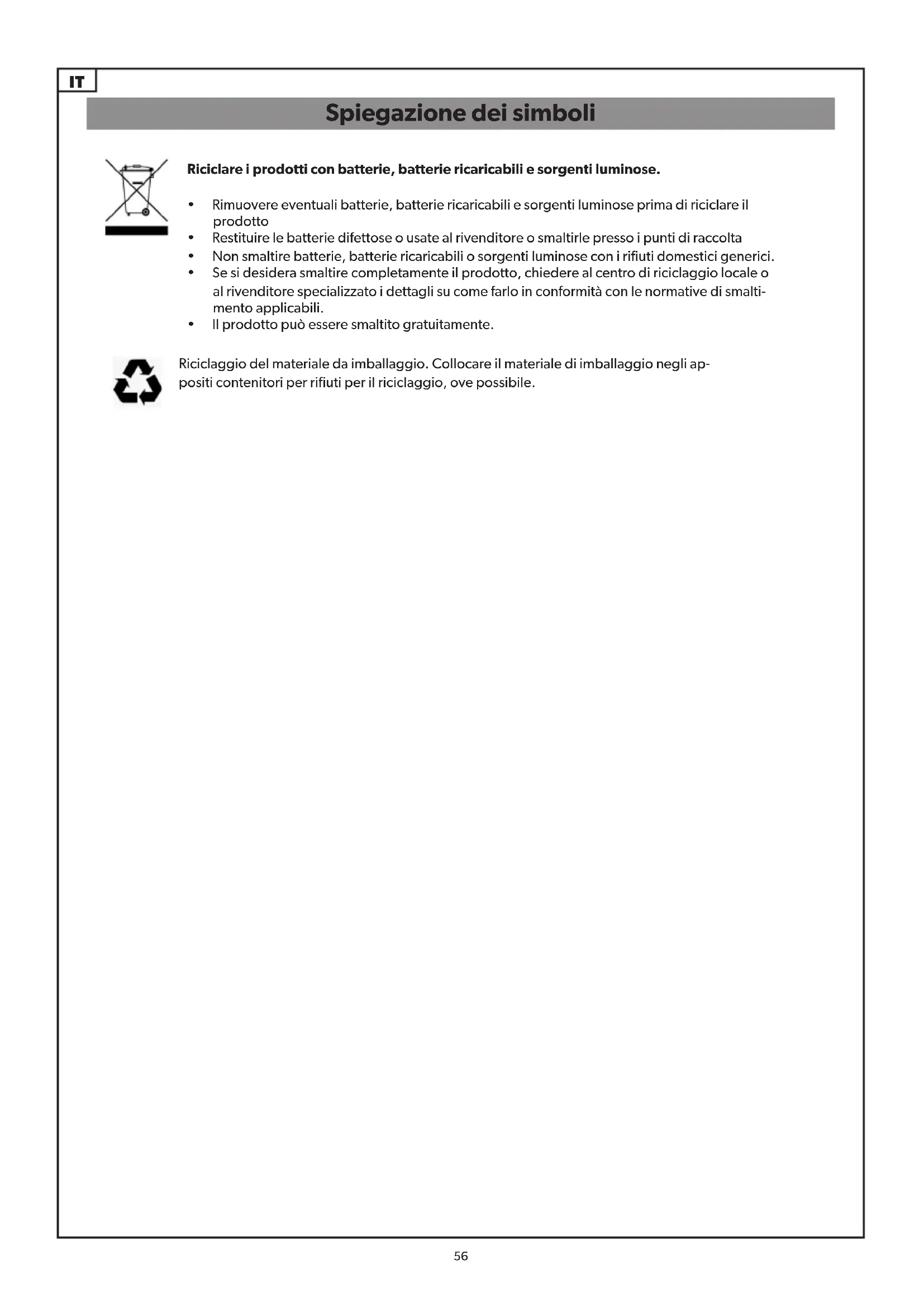 - Non smaltire batterie, batterie ricaricabili o sorgenti luminose con i rifiuti domestici generici.