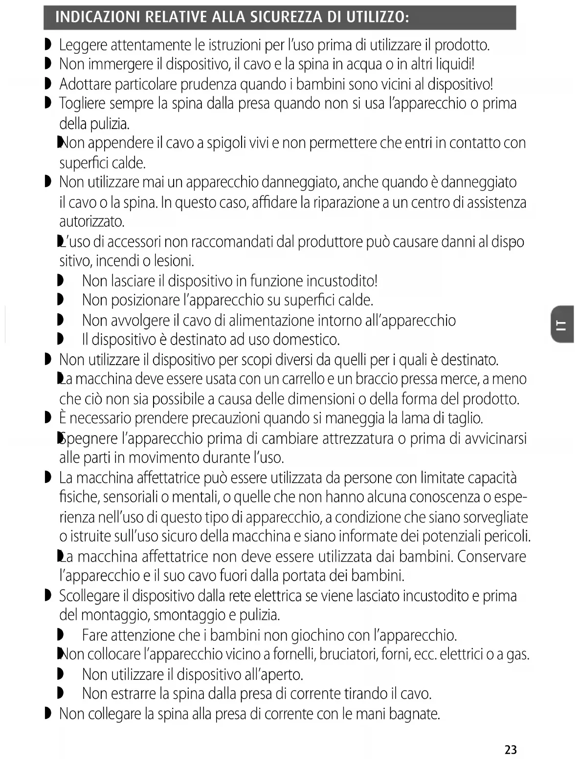 Spegnere l’apparecchio prima di cambiare attrezzatura o prima di avvicinarsi alle parti in movimento durante l’uso. La macchina affettatrice può essere utilizzata da persone con limitate capacità fisiche, sensoriali o mentali, o quelle che non hanno alcuna conoscenza o espe- rienza nell’uso di questo tipo di apparecchio, a condizione che siano sorvegliate o istruite sull’uso sicuro della macchina e siano informate dei potenziali pericoli.