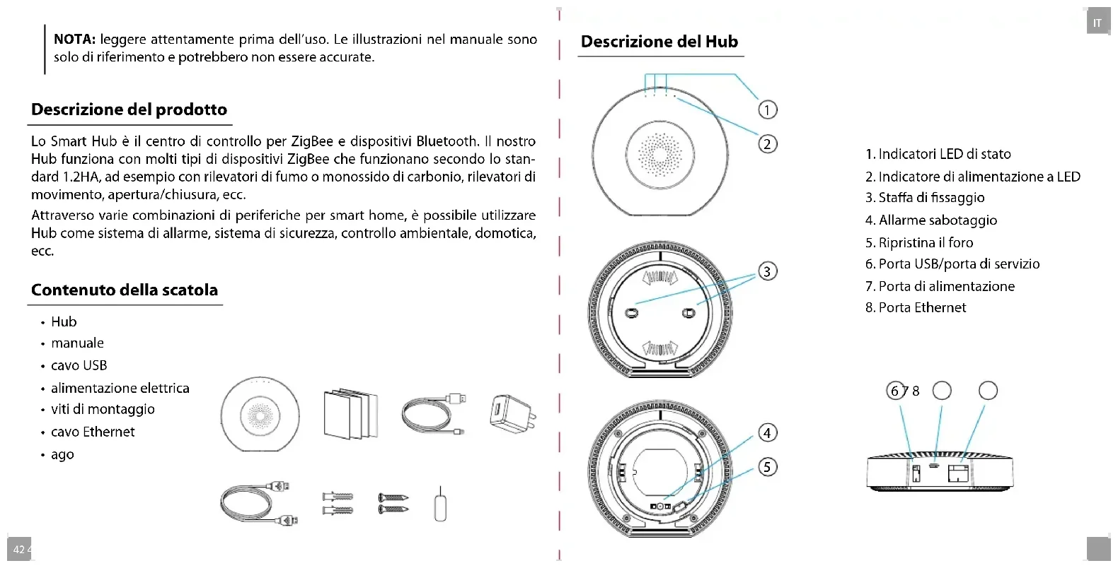 NOTA: leggere attentamente prima dell’uso. Le illustrazioni nel manuale sono solo di riferimento e potrebbero non essere accurate. Descrizione del prodotto Lo Smart Hub è il centro di controllo per ZigBee e dispositivi Bluetooth. Il nostro Hub funziona con molti tipi di dispositivi ZigBee che funzionano secondo lo stan- dard 1.2HA, ad esempio con rilevatori di fumo o monossido di carbonio, rilevatori di movimento, apertura/chiusura, ecc. Attraverso varie combinazioni di periferiche per smart home, è possibile utilizzare Hub come sistema di allarme, sistema di sicurezza, controllo ambientale, domotica, ecc. Contenuto della scatola