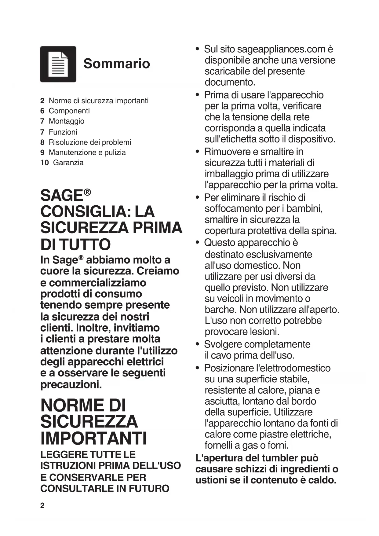 - Sul sito sageappliances.com è disponibile anche una versione scaricabile del presente documento.