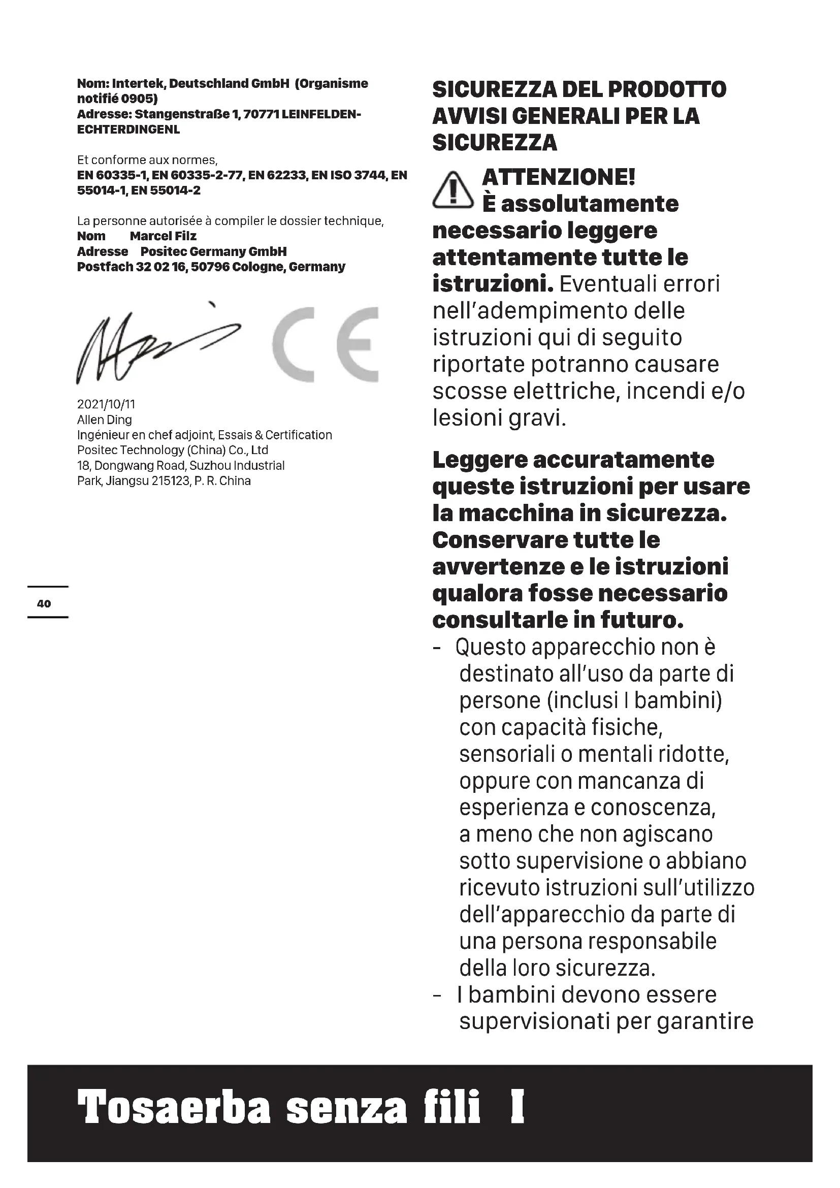 SICUREZZA ATTENZIONE! È assolutamente necessario leggere attentamente tutte le istruzioni. Eventuali errori nell’adempimento delle istruzioni qui di seguito riportate potranno causare scosse elettriche, incendi e/o lesioni gravi. Leggere accuratamente queste istruzioni per usare la macchina in sicurezza. Conservare tutte le avvertenze e le istruzioni qualora fosse necessario consultarle in futuro. - Questo apparecchio non è destinato all’uso da parte di persone (inclusi I bambini) con capacità fisiche, sensoriali o mentali ridotte, oppure con mancanza di esperienza e conoscenza, a meno che non agiscano sotto supervisione o abbiano ricevuto istruzioni sull’utilizzo dell’apparecchio da parte di una persona responsabile della loro sicurezza. - I bambini devono essere supervisionati per garantire41 Tosaerba senza fili I che non giochino con l’apparecchio. - Il dispositivo deve essere utilizzato unicamente con l’unità di alimentazione fornita in dotazione. IMPORTANTE LEGGERE ATTENTAMENTE