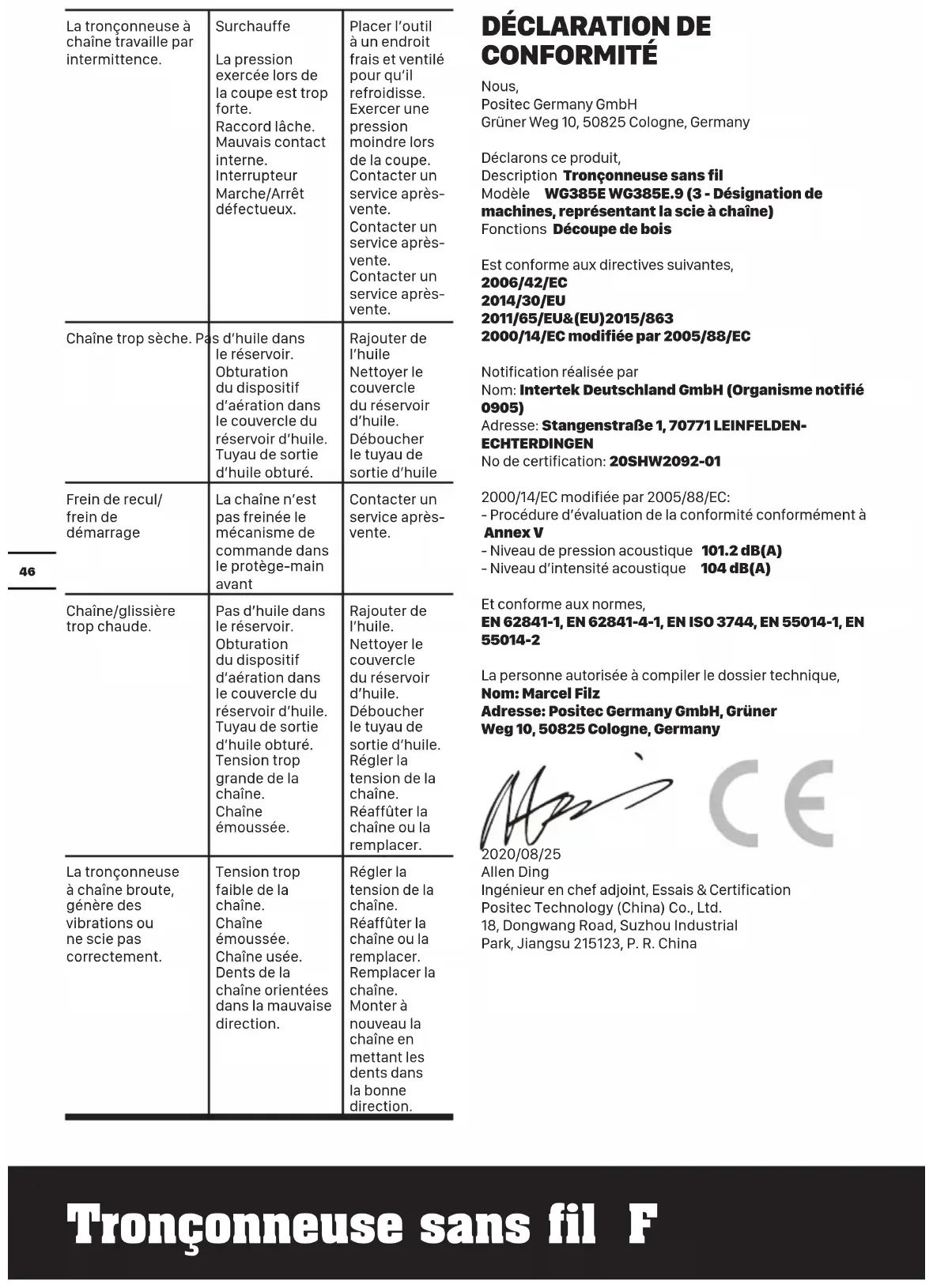 intermittenza. Surriscaldamento Pressione eccessiva applicata durante il taglio. Allentare l’attacco. Contatto interno labile. Interruttore avvio/ arresto difettoso. Posizionare la macchina in un logo fresco e ventilato per farla raffreddare Applicare una pressione relativamente inferiore durante il taglio. Rivolgersi ad un’officina specializzata. Rivolgersi ad un’officina specializzata. Rivolgersi ad un’officina specializzata. Catena della sega asciutta. Manca olio nel serbatoio dell’olio. La disaerazione nel tappo del serbatoio per l’olio è otturata. Canale della fuoriuscita dell’olio otturato. Versare dell’olio riempiendo il serbatoio. Pulire il tappo del serbatoio per l’olio. Liberare il canale della fuoriuscita dell’olio. Frenacatena/ freno motore Problema con il meccanismo di commutazione nella protezione mano anteriore Rivolgersi ad un’officina specializzata Catena/binario di guida troppo caldi. Manca olio nel serbatoio dell’olio. La disaerazione nel tappo del serbatoio per l’olio è otturata. Canale della fuoriuscita dell’olio otturato. Tensione della catena troppo alta. Catena non più affilata. Versare dell’olio riempiendo il serbatoio. Pulire il tappo del serbatoio per l’olio. Liberare il canale della fuoriuscita dell’olio. Regolare la tensione della catena. Riaffilare la catena oppure sostituirla.60 Motosierra inalámbrica ES La sega a catena si inceppa, vibra oppure non taglia correttamente. Tensione della catena troppo lenta. Catena non più affilata. Catena eccessivamente consumata. Dentatura della sega indica nella direzione sbagliata. Regolare la tensione della catena. Riaffilare la catena oppure sostituirla. Sostituire la catena. Montare di nuovo la catena della sega con la dentatura che indica nella direzione corretta. DICHIARAZIONE DI CONFORMITÀ Noi, Positec Germany GmbH Grüner Weg 10, 50825 Cologne, Germany Dichiariamo che l’apparecchio, Descrizione Sega a catena senza filo Codice WG385E WG385E.9 (3 - designazione del macchinario, rappresentativa di motosega) Funzioni Taglio legno È conforme alle seguenti direttive, 2006/42/EC 2014/30/EU 2011/65/EU&(EU)2015/863 2000/14/EC amended by 2005/88/EC L’organismo competente Nome: Intertek Deutschland GmbH (organismo notificato 0905) Indirizzo: Stangenstraße 1, 70771 LEINFELDEN- ECHTERDINGEN Certificazione N.:20SHW2092-01 2000/14/EC modificato da 2005/88/EC: - Procedura di conformità come da Annex V - Potenza acustica pesata 101.2 dB(A) - Massima potenza di rumore garantita 104 dB(A) conforme a, EN 62841-1, EN 62841-4-1, EN ISO 3744, EN 55014-1, EN 55014-2 Il responsabile autorizzato alla compilazione della documentazione tecnica, Nome: Marcel Filz Indirizzo: Positec Germany GmbH, Grüner Weg 10, 50825 Cologne, Germany 2020/08/25 Allen Ding Vice capo ingegnere, testing e certificazione Positec Technology (China) Co., Ltd. 18, Dongwang Road, Suzhou Industrial Park, Jiangsu 215123, P. R. China