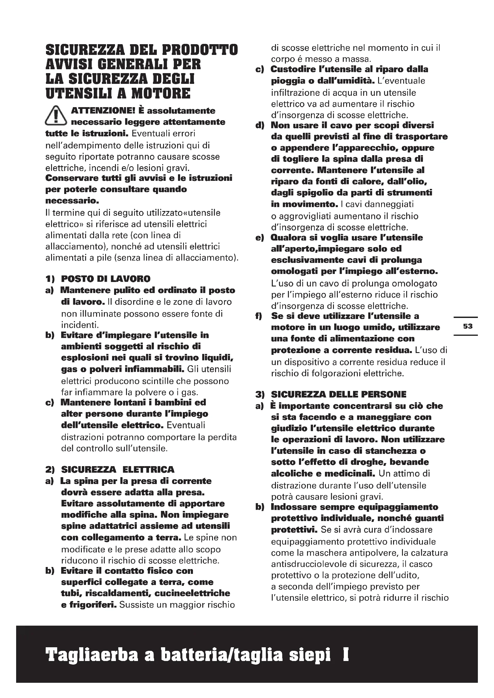 a) È importante concentrarsi su ciò che si sta facendo e a maneggiare con giudizio l’utensile elettrico durante le operazioni di lavoro. Non utilizzare l’utensile in caso di stanchezza o sotto l’effetto di droghe, bevande alcoliche e medicinali. Un attimo di distrazione durante l’uso dell’utensile potrà causare lesioni gravi. b) Indossare sempre equipaggiamento protettivo individuale, nonché guanti protettivi. Se si avrà cura d’indossare equipaggiamento protettivo individuale come la maschera antipolvere, la calzatura antisdrucciolevole di sicurezza, il casco protettivo o la protezione dell’udito, a seconda dell’impiego previsto per l’utensile elettrico, si potrà ridurre il rischio54 Tagliaerba a batteria/taglia siepi I di ferite. c) Evitare avviamenti involontari. Controllare che l’interruttore sia nella posizione off prima di effettuare il collegamento a una sorgente di alimentazione/batteria, e prima di sollevare o trasportare l’utensile. Il fatto di tenere il dito sopra all’interruttore o di collegare l’utensile accesso all’alimentazione di corrente potrà essere causa di incidenti. d) Togliere gli attrezzi di regolazione o la chiave inglese prima di accendere l’utensile. Un utensile o una chiave inglese che si trovino in una parte di strumento in rotazione potranno causare lesioni. e) È importante non sopravvalutarsi. Avere curadi mettersi in posizione sicura e di mantenere l’equilibrio. In tale maniera sarà possibile controllare meglio l’apparecchio in situazioni inaspettate. f) Indossare vestiti adeguati. Evitare di indossare vestiti lenti o gioielli. Tenere i capelli, i vestiti ed i guanti lontani da pezzi in movimento. Vestiti lenti, gioielli o capelli lunghi potranno impigliarsi in pezzi in movimento. g) Se sussiste la possibilità di montare dispositivi di aspirazione o di captazione della polvere, assicurarsi che gli stessi siano stati installati correttamente e vengano utilizzati senza errori. L’impiego dei suddetti dispositivi diminuisce il pericolo rappresentato dalla polvere.