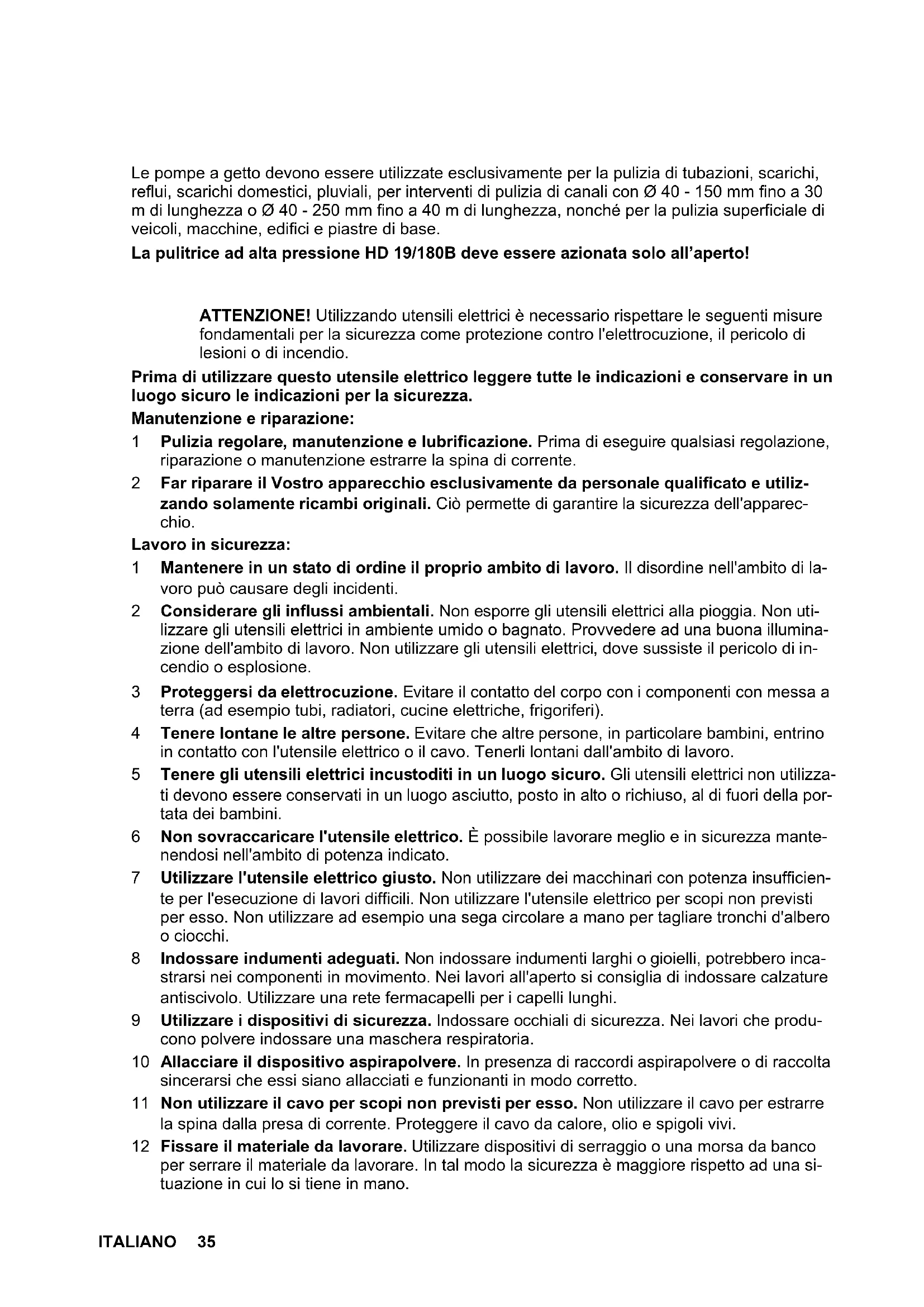 Le pompe a getto devono essere utilizzate esclusivamente per la pulizia di tubazioni, scarichi, reflui, scarichi domestici, pluviali, per interventi di pulizia di canali con Ø 40 - 150 mm fino a 30 m di lunghezza o Ø 40 - 250 mm fino a 40 m di lunghezza, nonché per la pulizia superficiale di veicoli, macchine, edifici e piastre di base. La pulitrice ad alta pressione HD 19/180B deve essere azionata solo all’aperto!