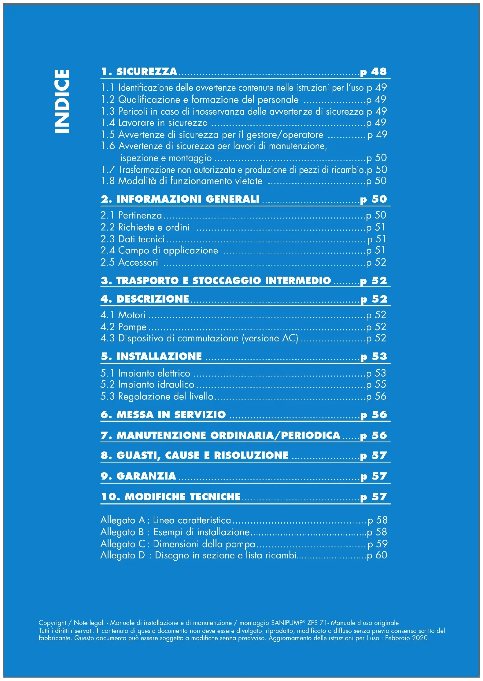 p 58 Allegato C : Dimensioni della pompa .....................................p 59 Allegato D : Disegno in sezione e lista ricambi