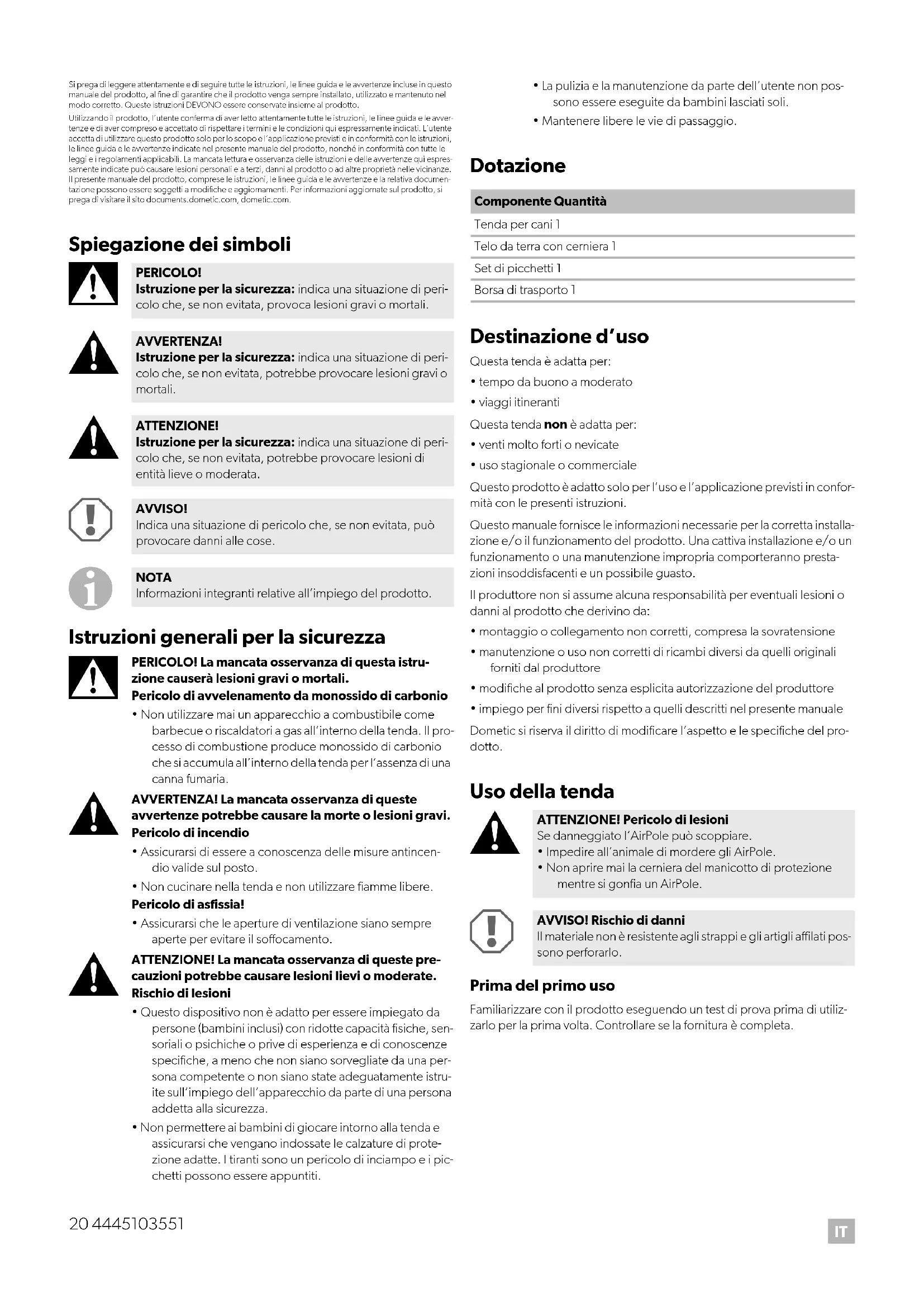 Prima del primo uso Familiarizzare con il prodotto eseguendo un test di prova prima di utiliz- zarlo per la prima volta. Controllare se la fornitura è completa. PERICOLO! Istruzione per la sicurezza: indica una situazione di peri- colo che, se non evitata, provoca lesioni gravi o mortali. AVVERTENZA! Istruzione per la sicurezza: indica una situazione di peri- colo che, se non evitata, potrebbe provocare lesioni gravi o mortali. ATTENZIONE! Istruzione per la sicurezza: indica una situazione di peri- colo che, se non evitata, potrebbe provocare lesioni di entità lieve o moderata. AVVISO! Indica una situazione di pericolo che, se non evitata, può provocare danni alle cose. NOTA Informazioni integranti relative all’impiego del prodotto. Componente Quantità Tenda per cani 1 Telo da terra con cerniera 1 Set di picchetti 1 Borsa di trasporto 1 ATTENZIONE! Pericolo di lesioni Se danneggiato l’AirPole può scoppiare.
