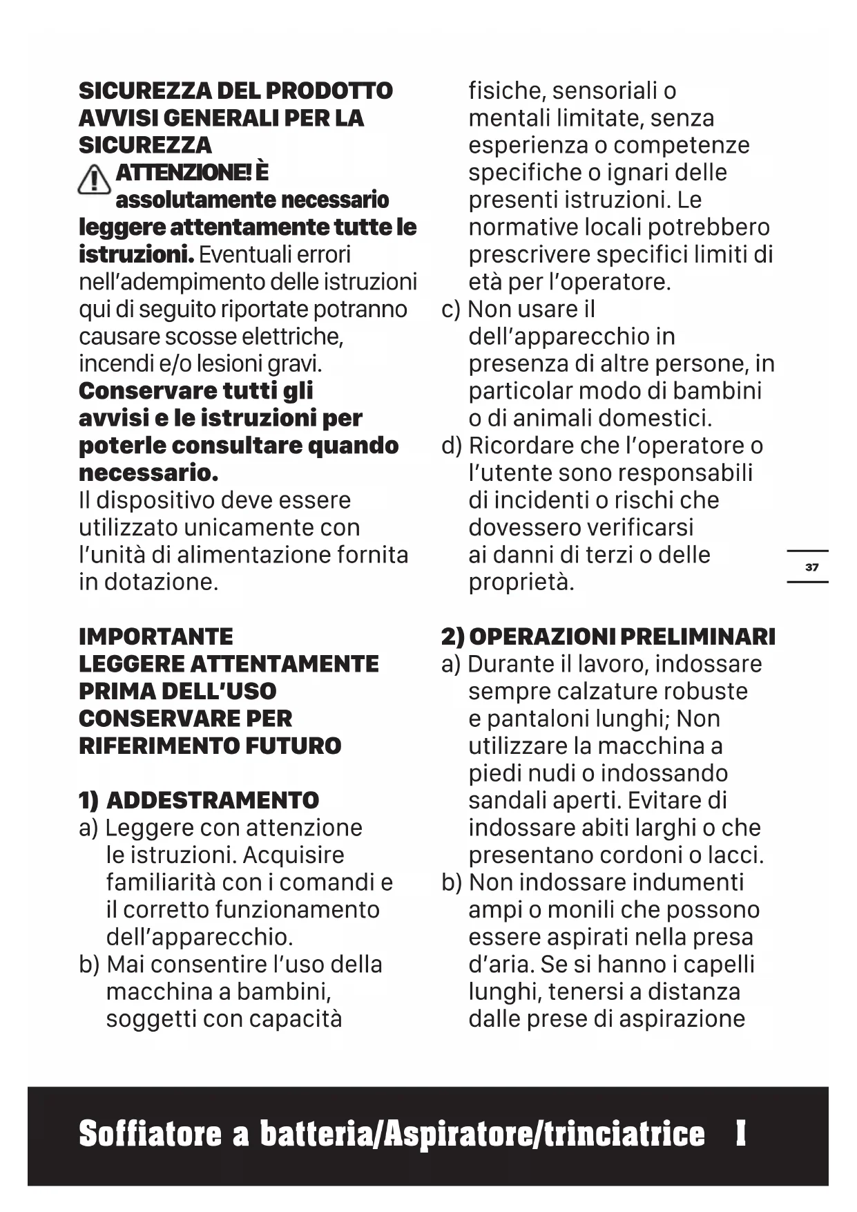 a) Durante il lavoro, indossare sempre calzature robuste e pantaloni lunghi; Non utilizzare la macchina a piedi nudi o indossando sandali aperti. Evitare di indossare abiti larghi o che presentano cordoni o lacci. b) Non indossare indumenti ampi o monili che possono essere aspirati nella presa d’aria. Se si hanno i capelli lunghi, tenersi a distanza dalle prese di aspirazione Soffiatore a batteria/Aspiratore/trinciatrice I38 Soffiatore a batteria/Aspiratore/trinciatrice I dell’aria; c) Procurarsi dispositivi di protezione acustica e occhiali di sicurezza e indossarli sempre durante l’uso della macchina. d) Azionare la macchina in una posizione raccomandata ed esclusivamente su una superficie stabile e piana. e) Non utilizzare la macchina su un fondo lastricato o con ghiaia, dove potrebbe venire scagliato del materiale, con la possibilità che si verifichino lesioni a persone. f) Prima dell’uso verificare sempre che gli strumenti di triturazione, i rispettivi bulloni di fissaggio e gli altri elementi di bloccaggio siano ben serrati, che l’alloggiamento non sia danneggiato e che le protezioni e gli schermi siano in posizione. Sostituire i componenti usurati o danneggiati in set, per conservare l’equilibrio della macchina. Sostituire le etichette danneggiate o illeggibili.